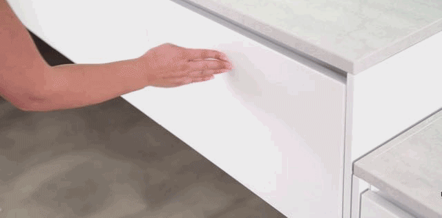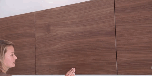 所有橱柜门板也都暗藏玄机,内置重力传感器,轻按一下就开。比现在流行的阻尼铰链、阻尼抽屉、随意停气撑都更加高级。表面不需要拉手,门板干干净净。