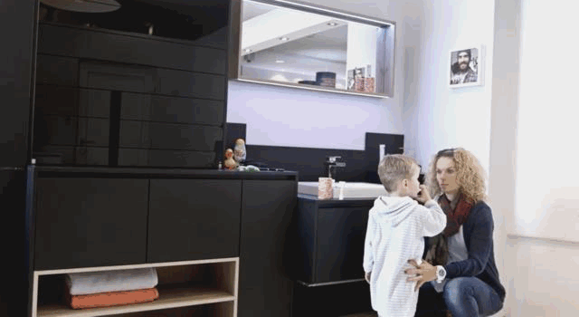 总之,你想到或者想不到的功能,这个厨房都有了。公司不仅只是设计厨房,他们也有卫生间智能化装备,同样的台面升降系统,大人小孩都方便使用。