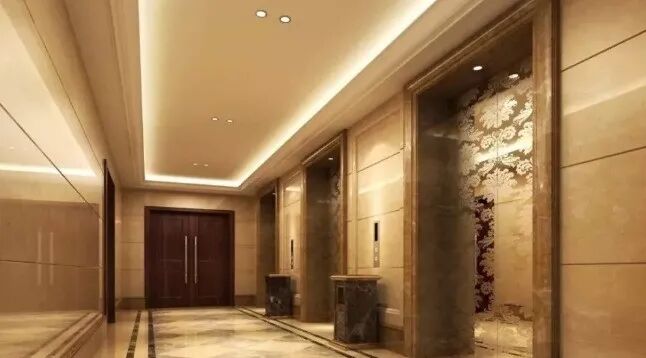 电梯间属于酒店的公共区域,是人流比较集中的地方,对石材及装饰效果要求比较高。电梯间的形状一般都是比较规则的长方形,面积不大,对石材的加工与施工要求也较高,要求墙面地面搭配自然、融为一体。