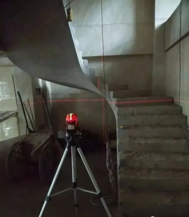 旋梯平面尺寸的测量方式,通过铅锤吊线在地面,选择尽可能多的点将楼梯土建的边缘轮廓投影到地面上,再根据节点图尺寸将拦河外侧(及内侧)石材的完成面线在地面放出来,考虑到土建误差,在放完成面线的过程中,可以将弧线尽可能的圆滑过渡,能用尽可能少的圆弧来做完成面,确保装饰效果。