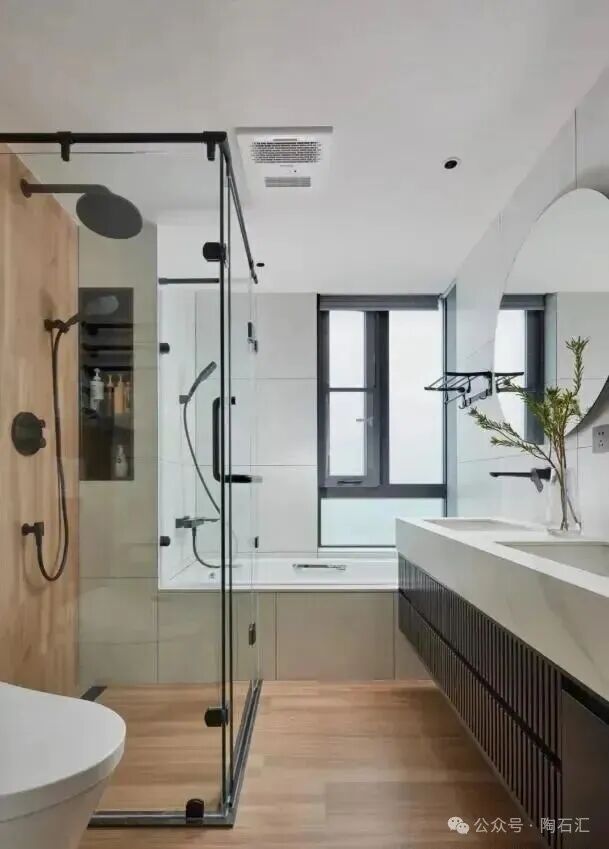 卫生间墙地都可以采用木纹砖铺贴,在大面积柔光瓷砖衬托下,更温馨舒服.