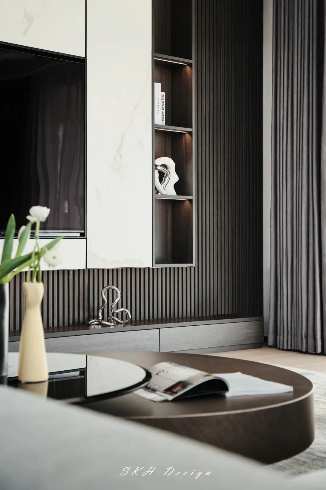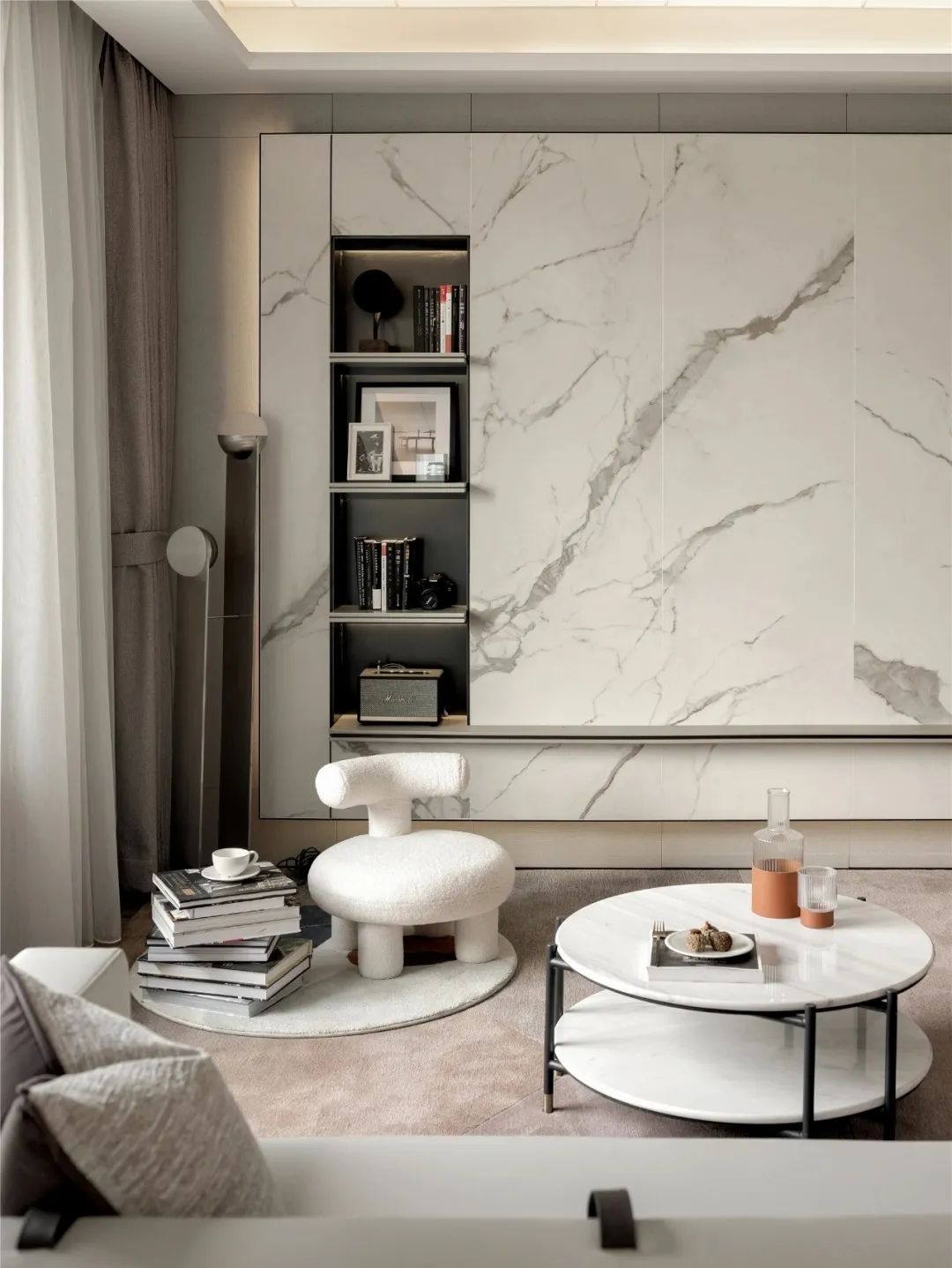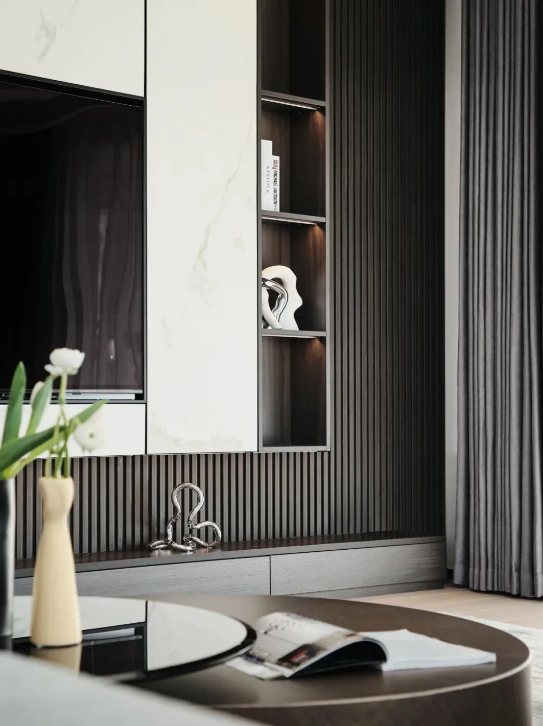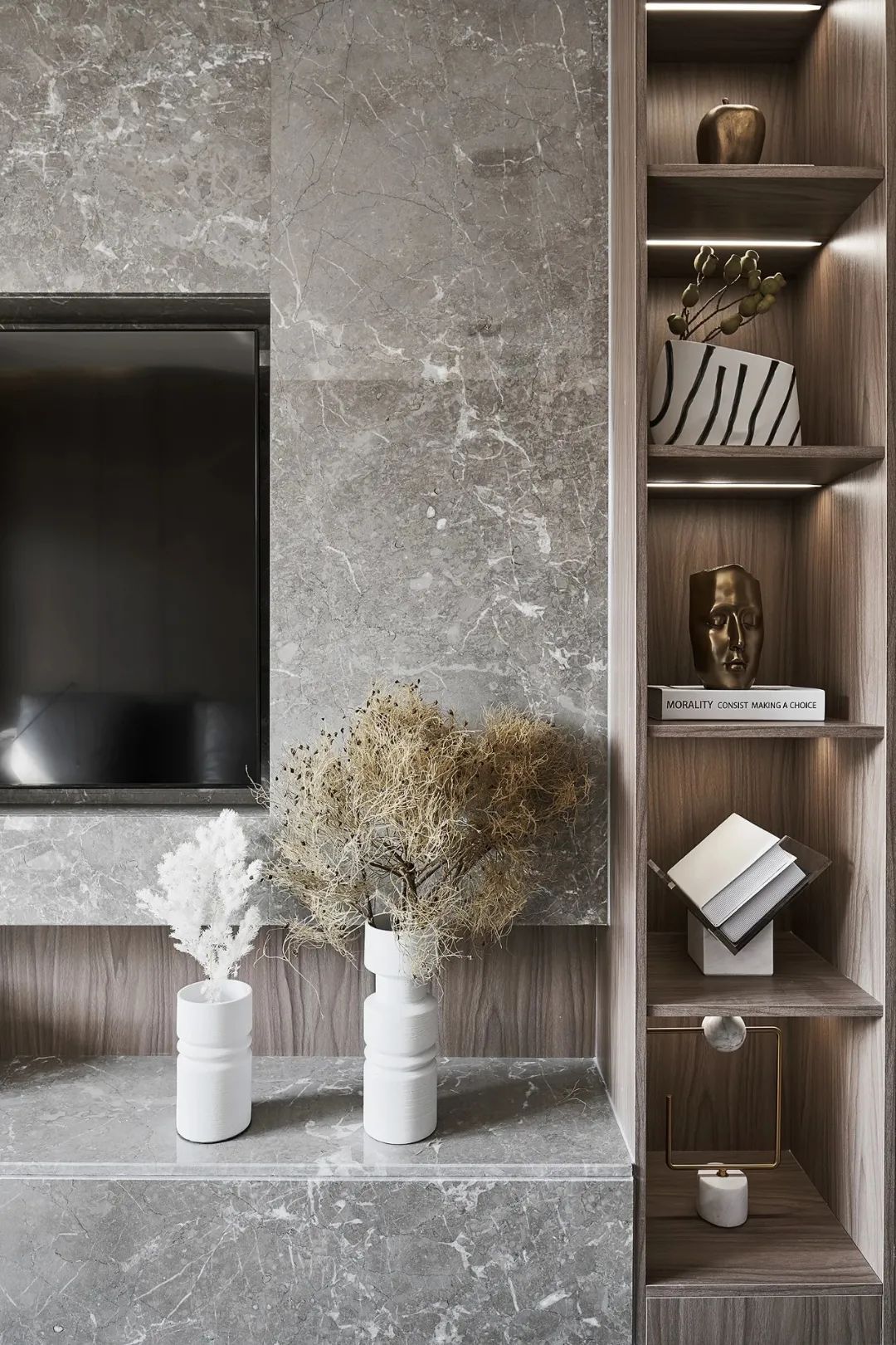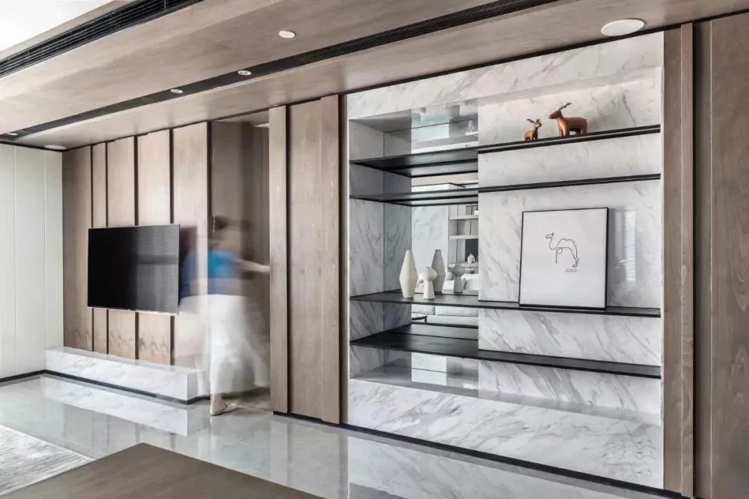 如今房价越来越贵,蜗居生活收纳是个大问题,家里的每一寸都必须合理利用,用石材打造的多功能电视背景墙,做到收纳的同时,还能起到装饰作用,美观大气。