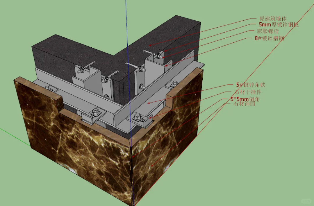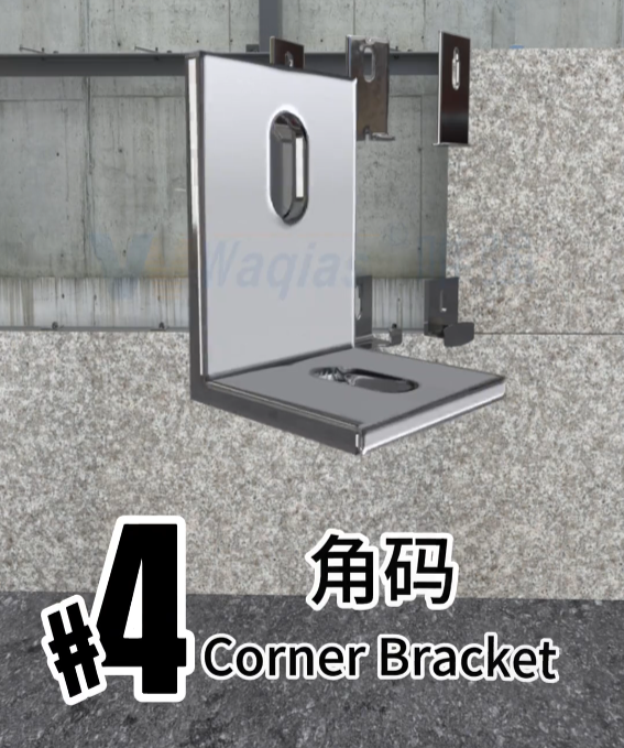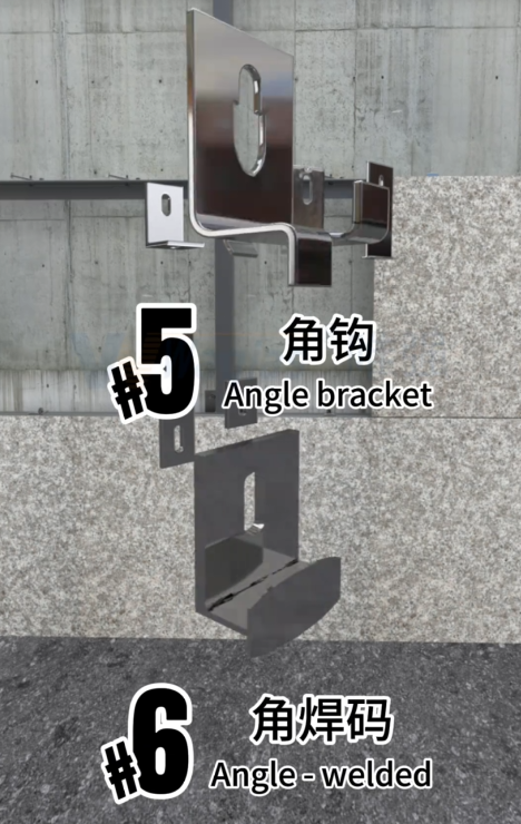 石材角钩和角焊码。墙面平整的小工程可以用角钩和角焊码,就连角码都省了。缺点是对墙面平整度有一定要求。