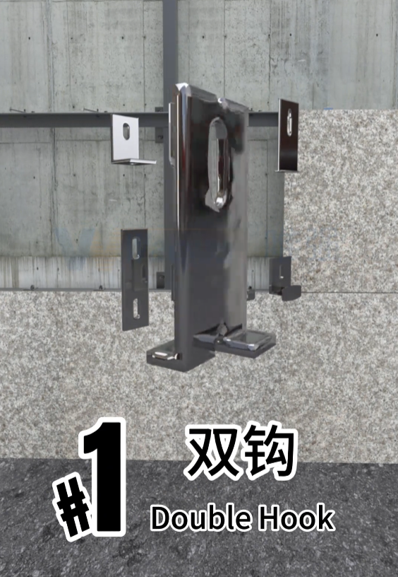双勾干挂件,是上下连接干挂件,它和T形焊件都是一般石材干挂最常用的,因为它能在保证安全的前提下,所需的工时相对背栓更短,缺点是不方便拆卸更换。