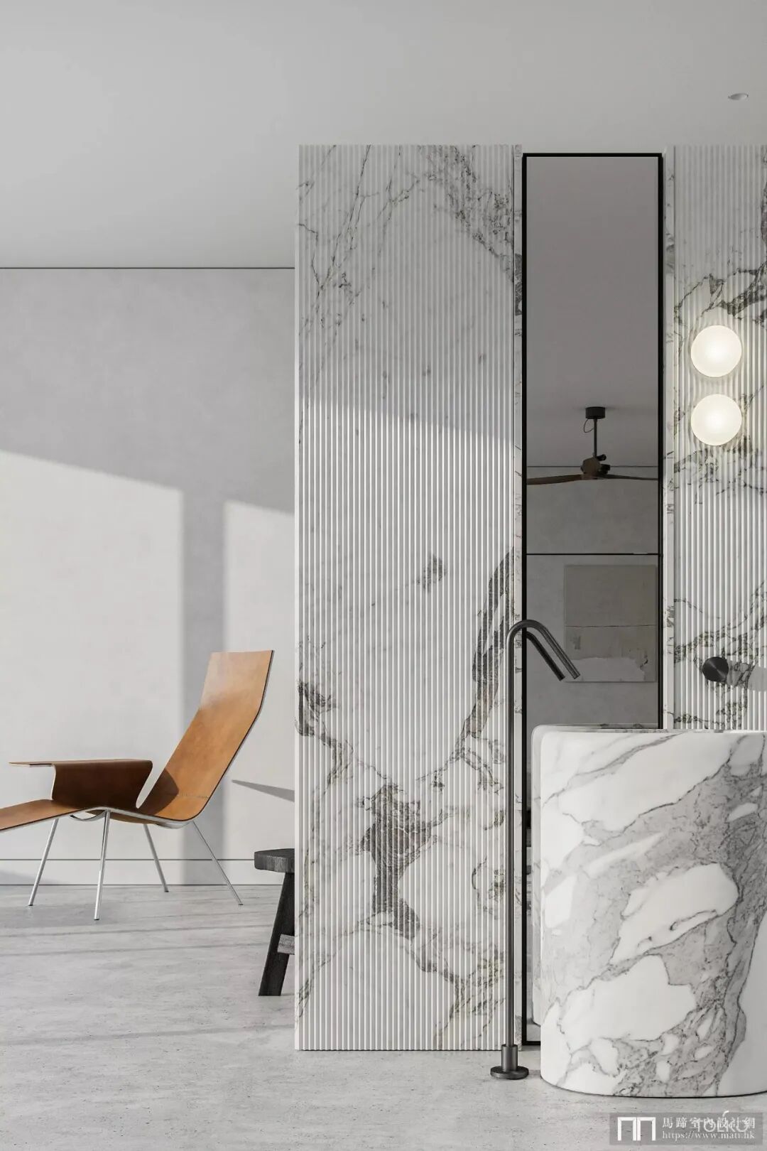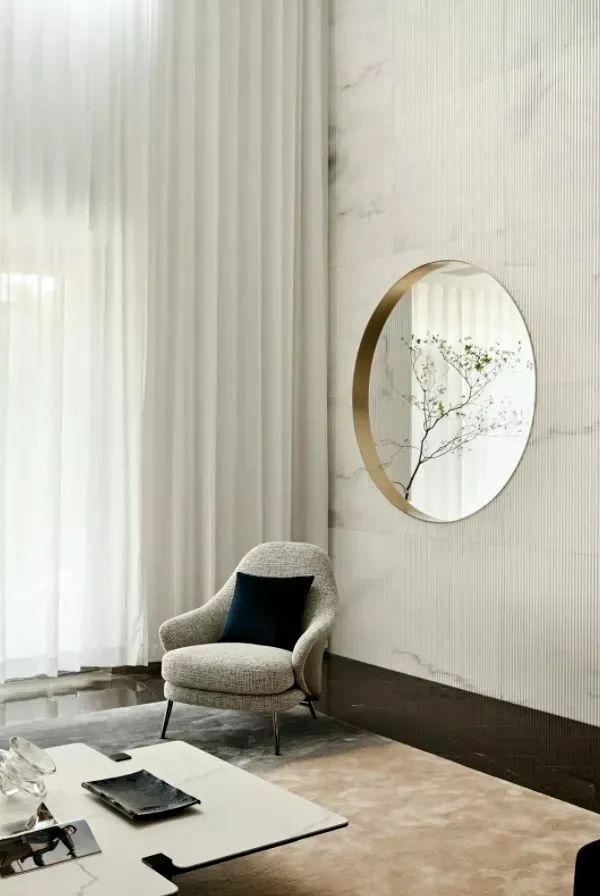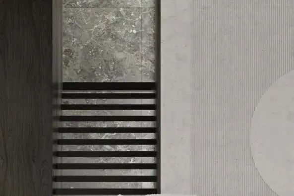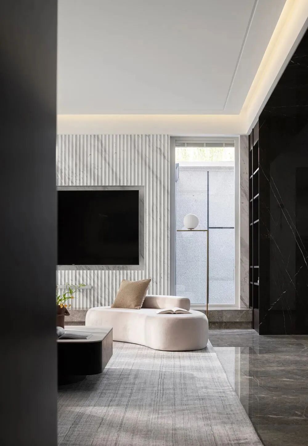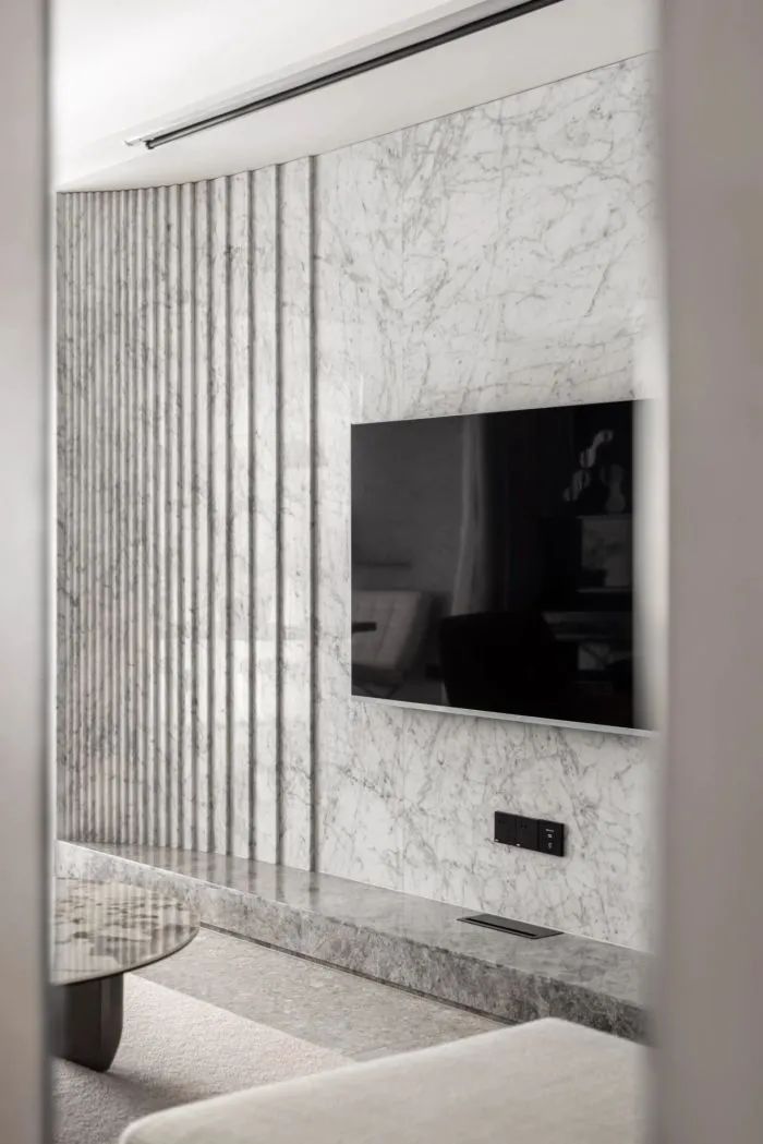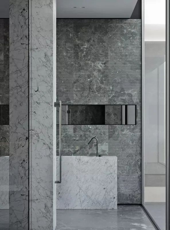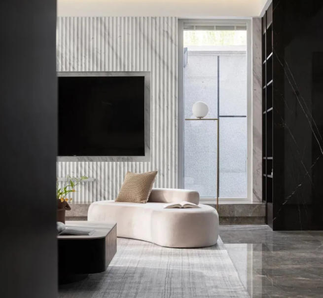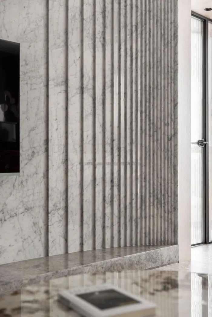 石材拉槽天然独特的纹理加上格栅线条的刚毅,更加的轻奢时尚,构成整洁、大方、有品位的空间。