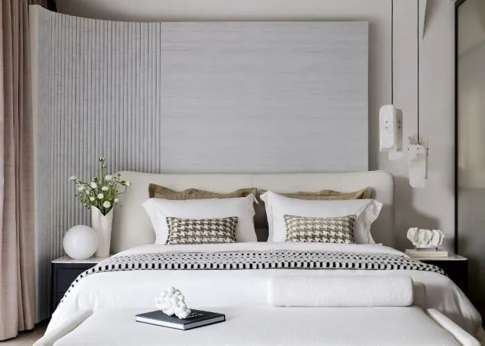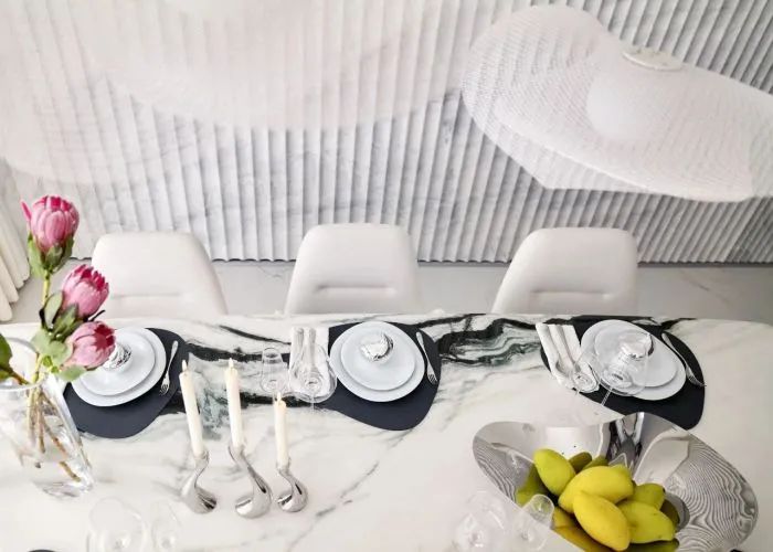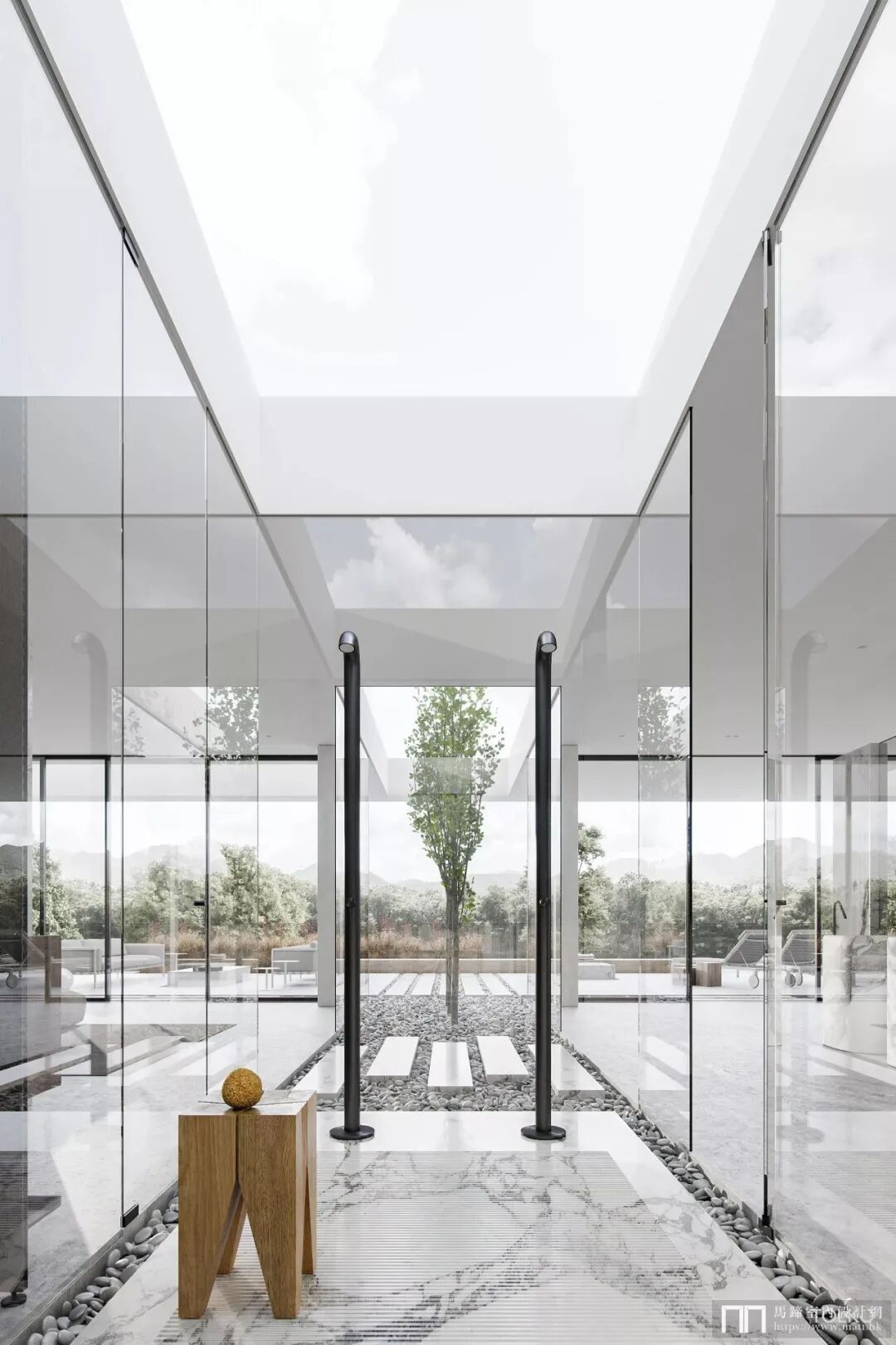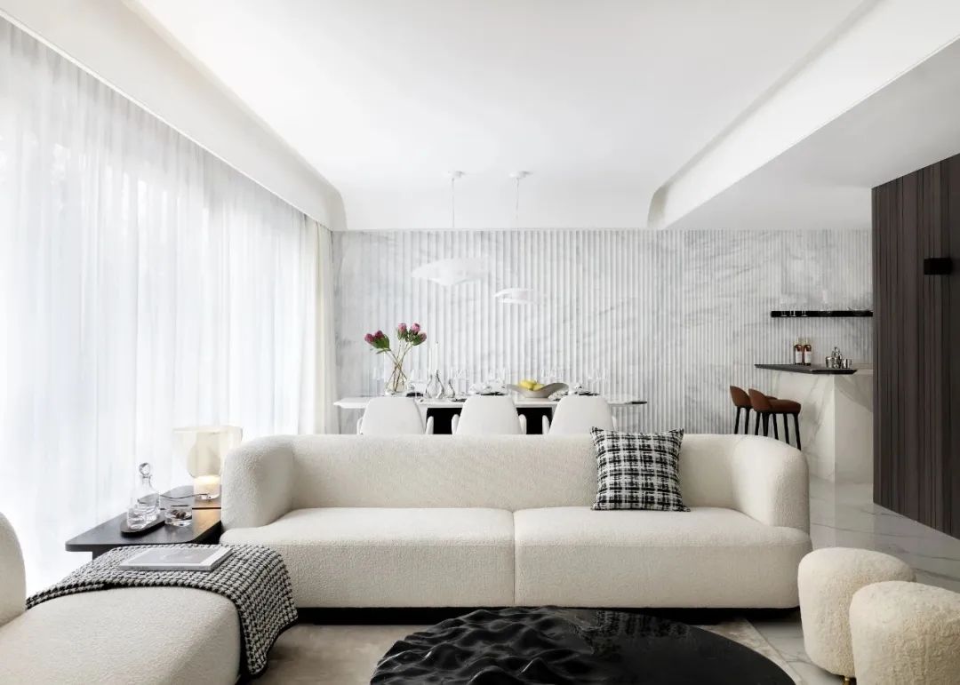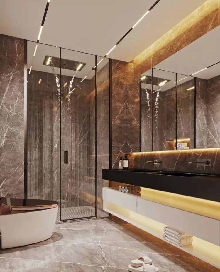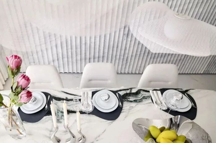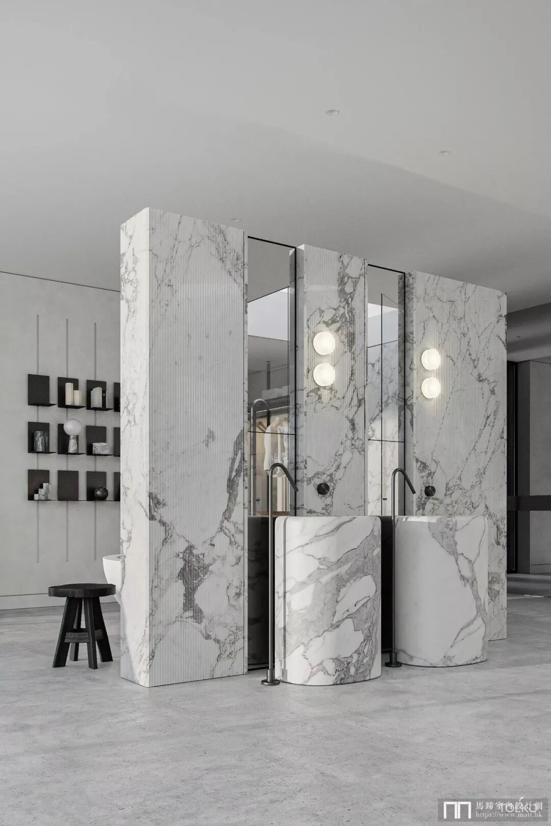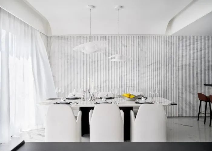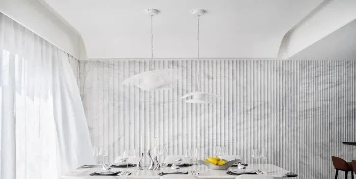石材拉槽天然独特的纹理加上格栅线条的刚毅,更加的轻奢时尚,构成整洁、大方、有品位的空间。