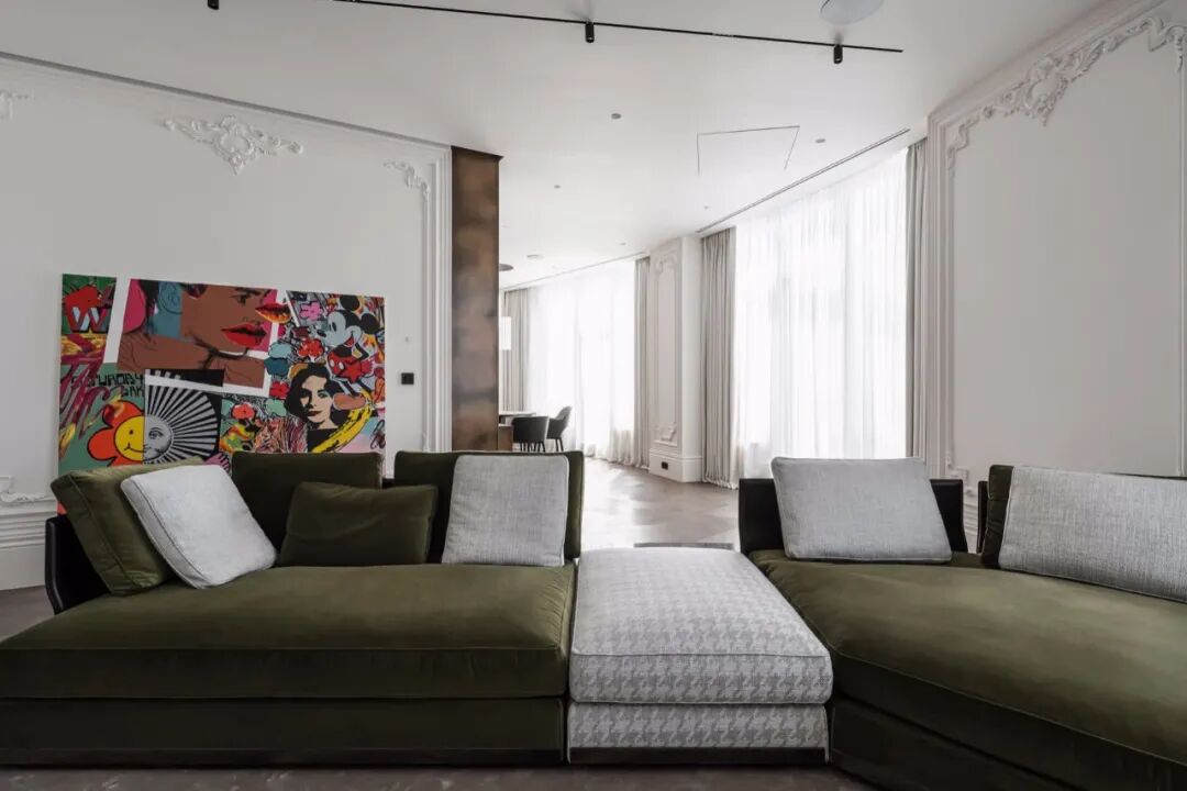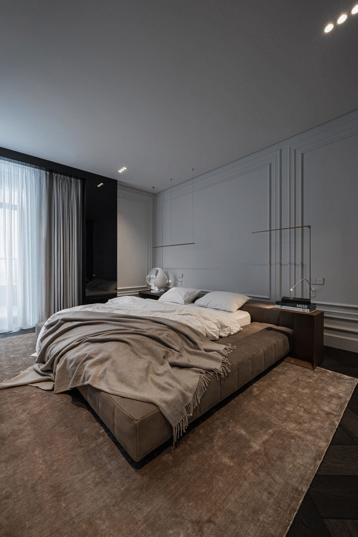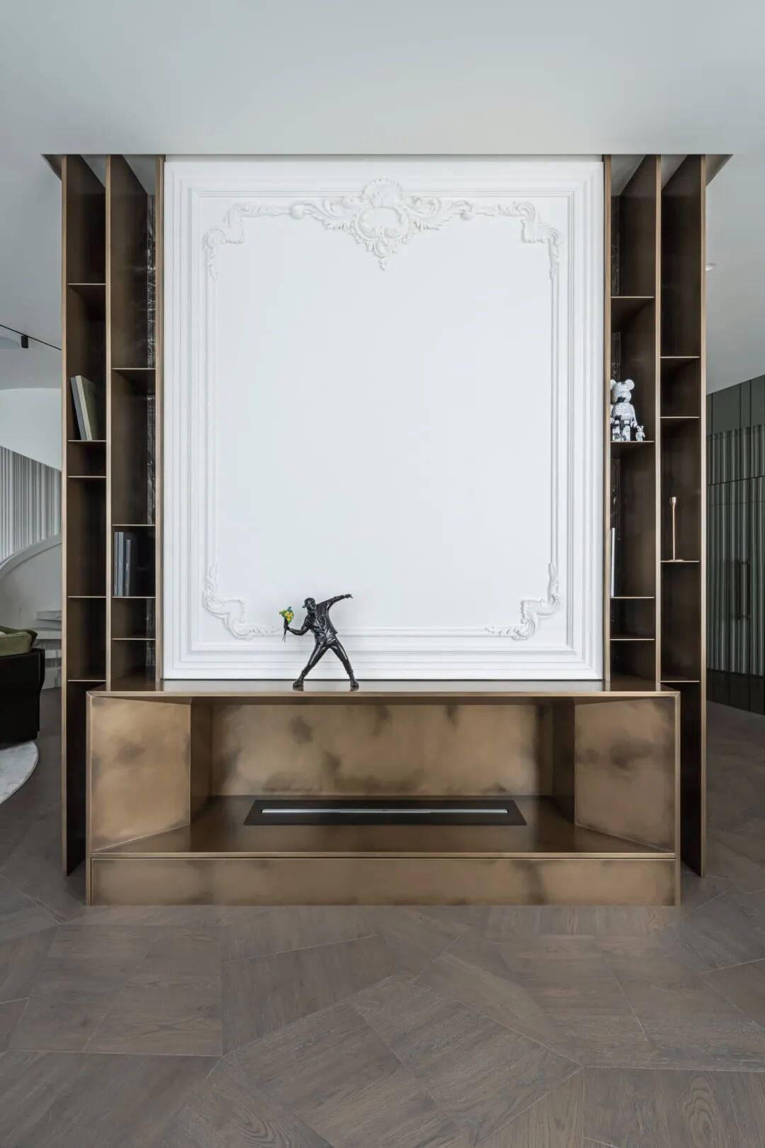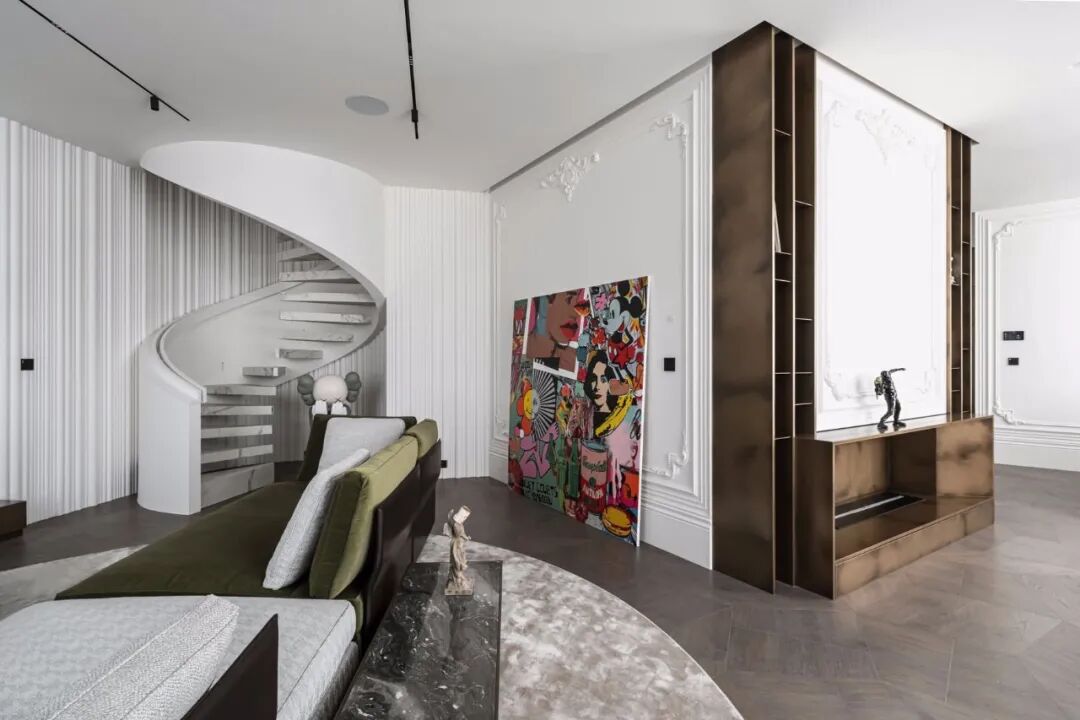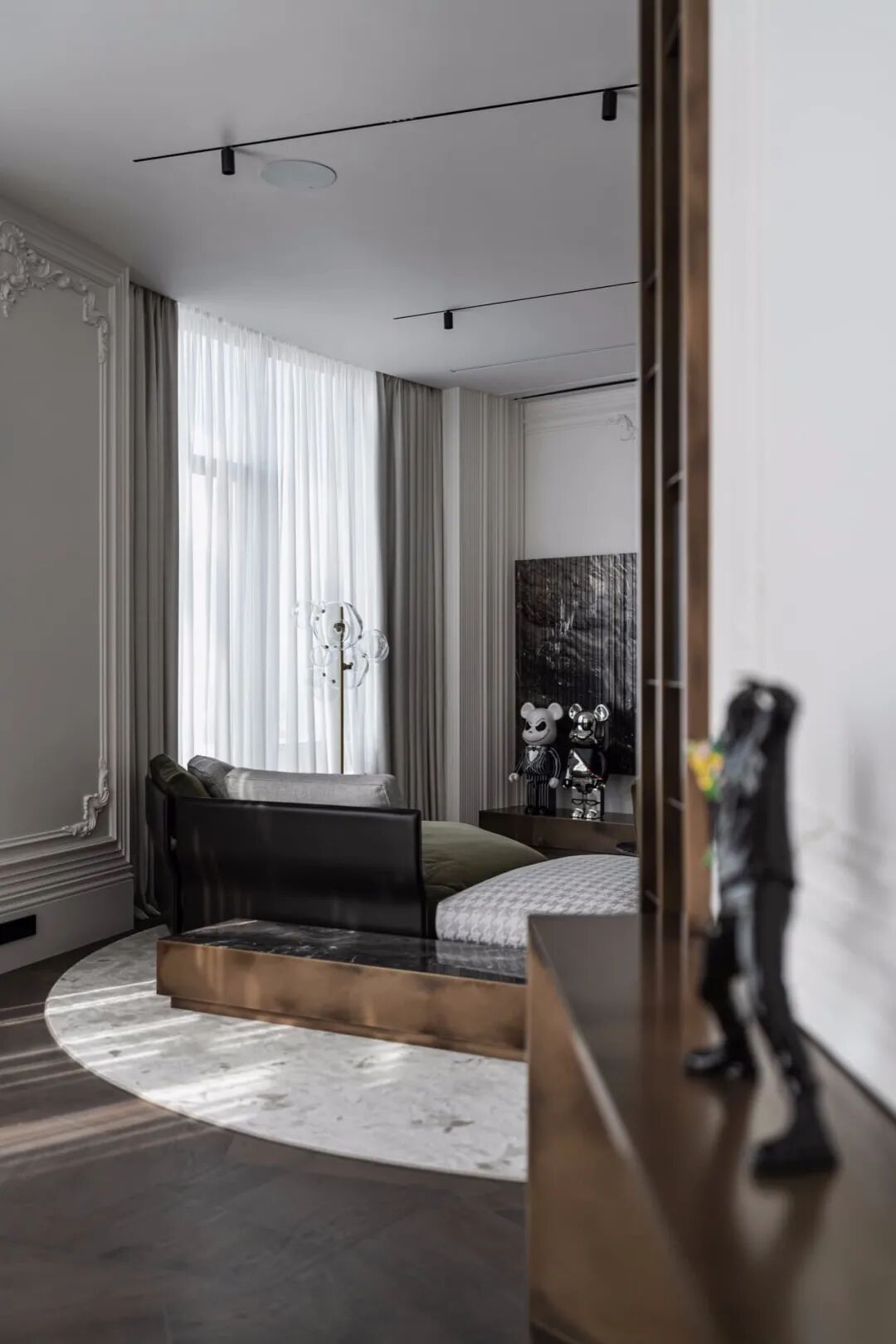 本空间为设计团队IQOSA Architect设计的一个顶层复式,面积为321平方米,是设计师Dmitry Babanin、Nikita Ryazhko、Aleksandra Maklyakova共同创作的一个项目,整体设计风格是古典现代交错。
