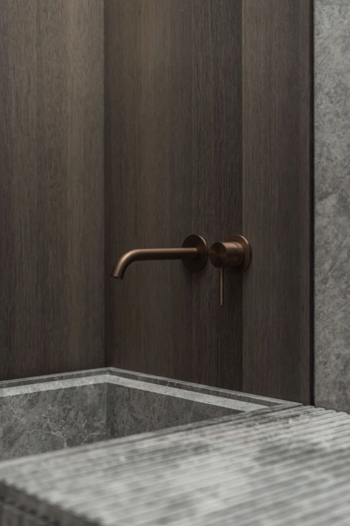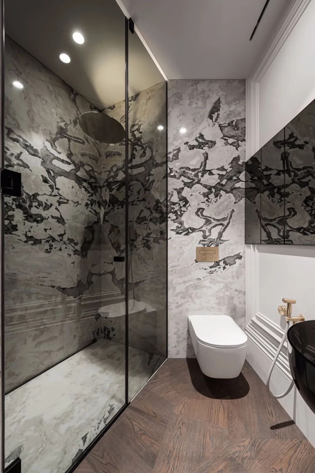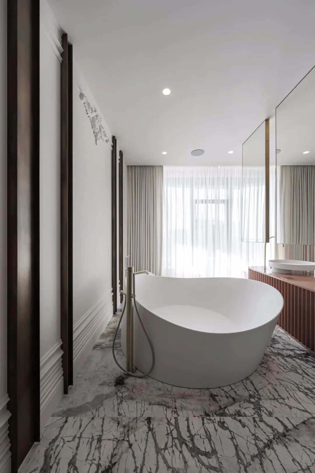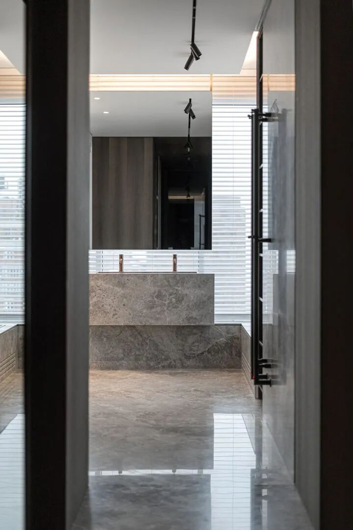 浴室空间采用寒江雪大理石,灰色的花纹个性十足,浴室的层次感和空间感也得以体现。