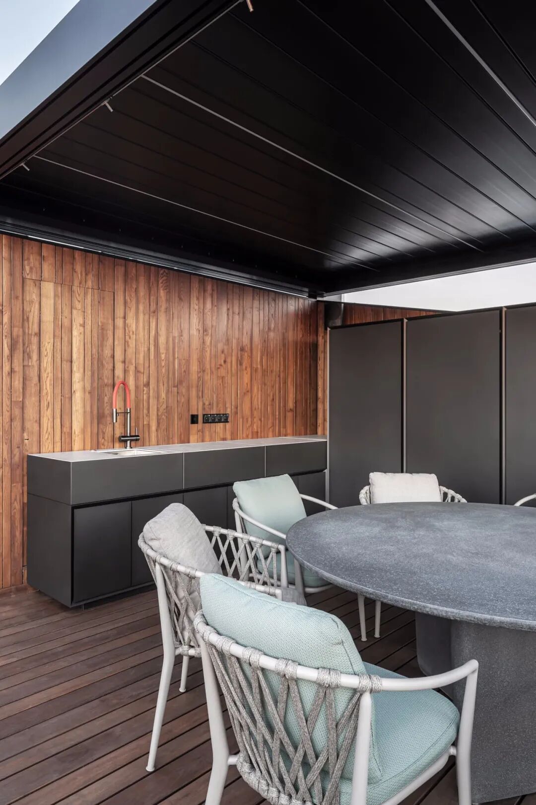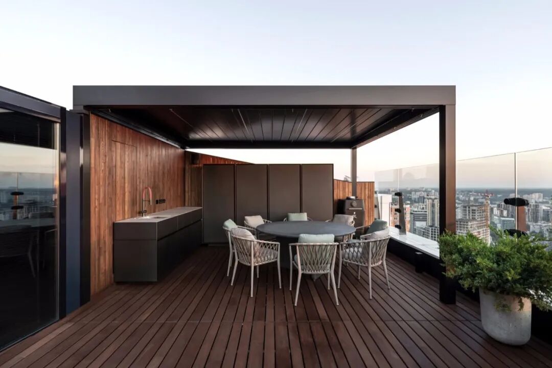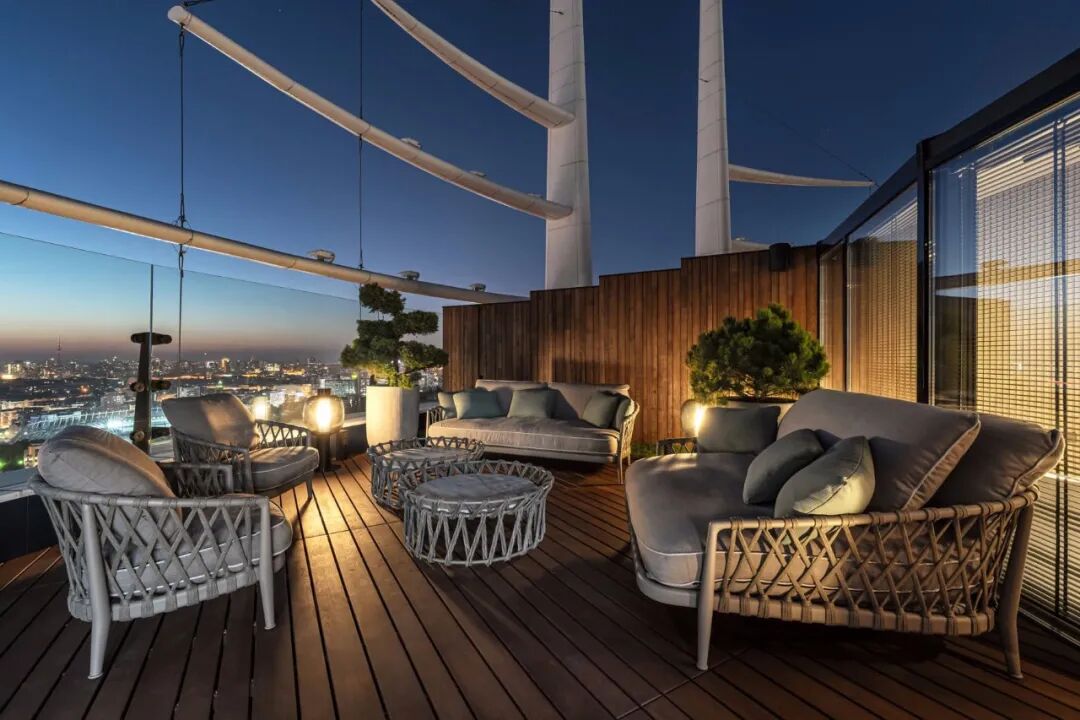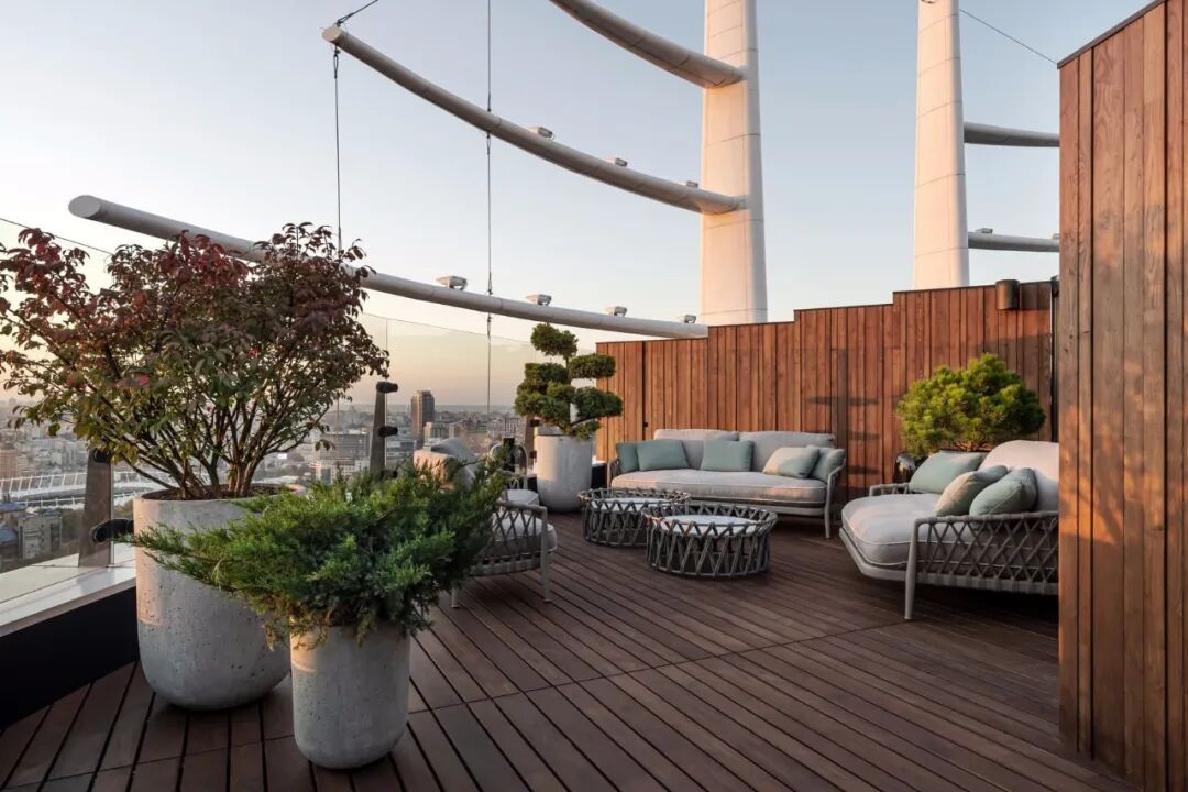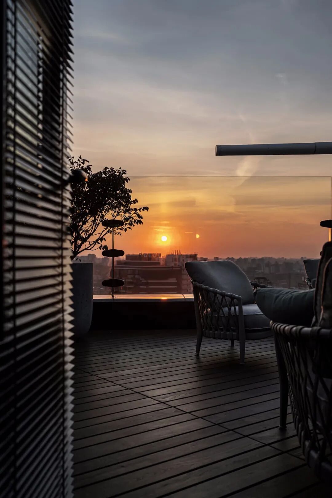 空间中的露台可供开派对和休息,让城市美景引入设计,还放置了各种绿植作为点缀。