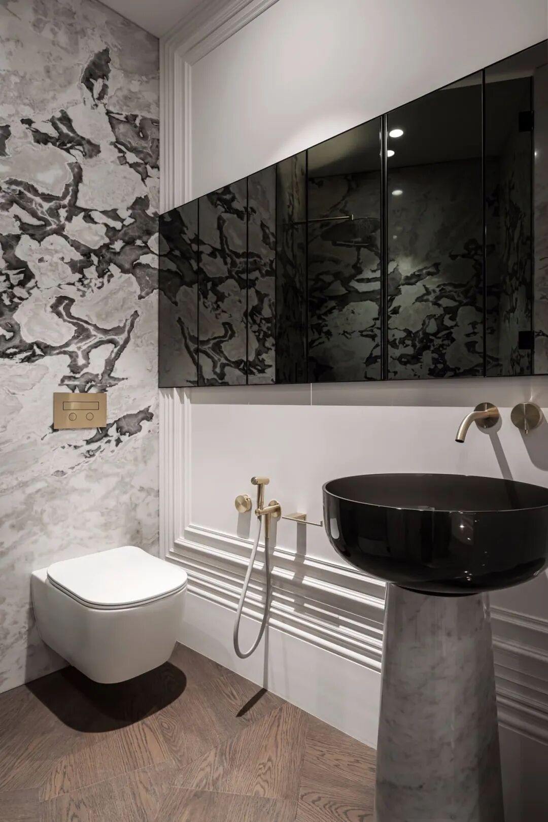 客卧浴室采用的灰色大理石墙面,纹理夸张个性十足,也增加了空间的层次感。