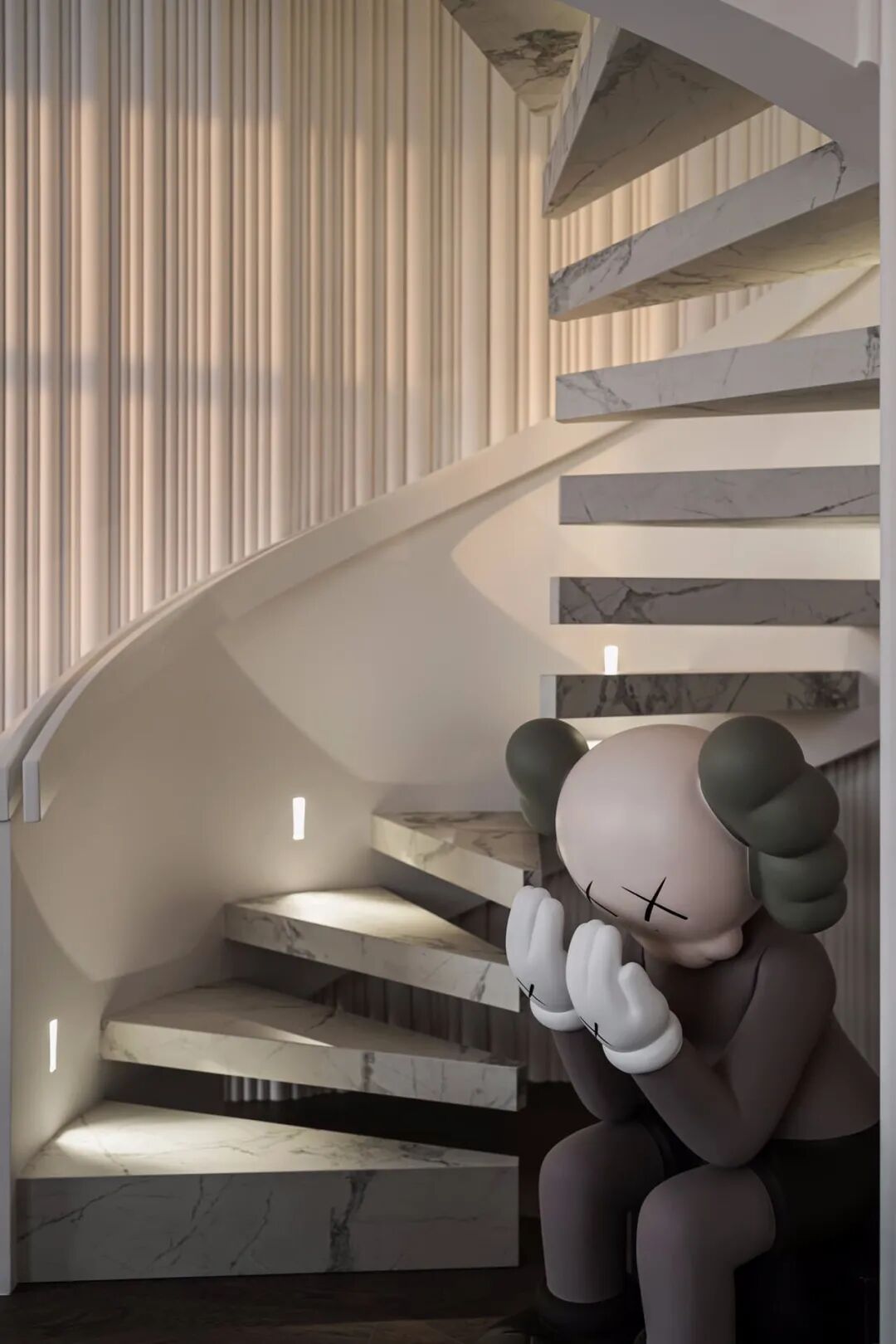 走廊空间连接着大理石旋梯,并设置了一个石材凳子可以坐下来换鞋或者歇脚。