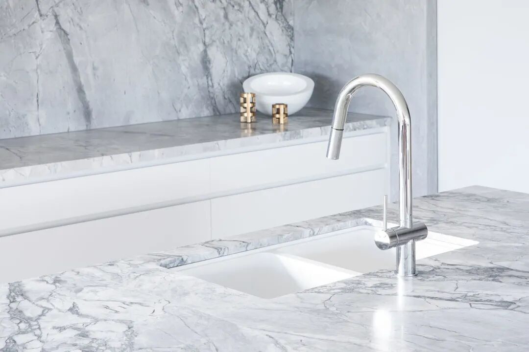 卫生间的大理石洗手台与白色格子瓷砖的墙面形成和谐统一的。