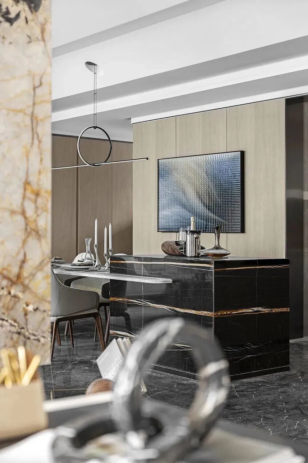 意大利灰网纹不规则的纹理变奏,将整个空间的格调推向一个更丰富饱满的层次,充满柔和的气息,与光影交映成趣。