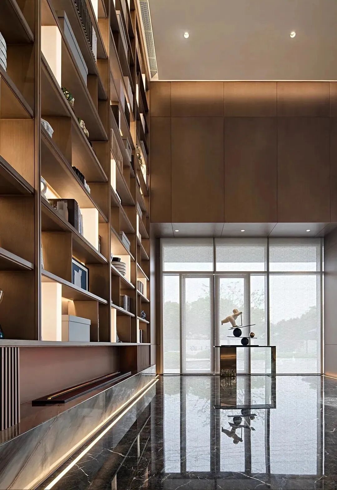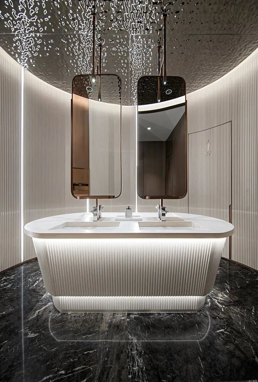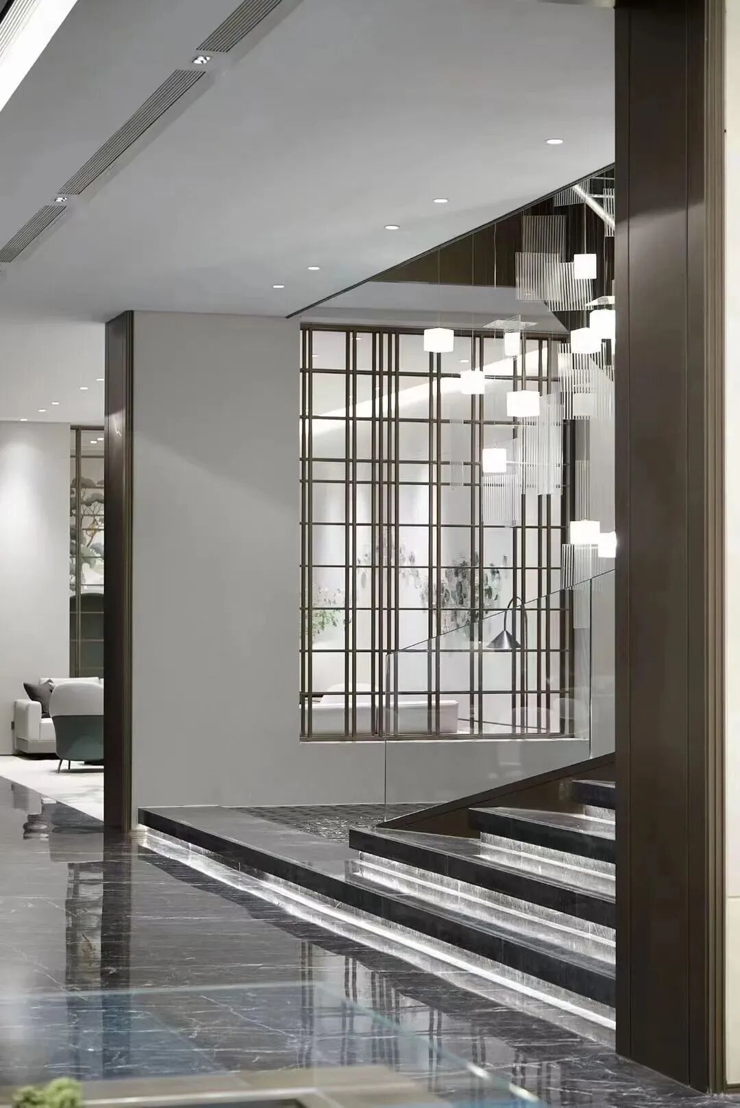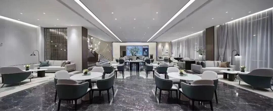 襟怀当代,承韵古都,设计以前瞻性的精神诉求,凝聚时空,去繁存简,地面采用正矿意大利灰网纹结合现代艺术美学与东方风雅意境。