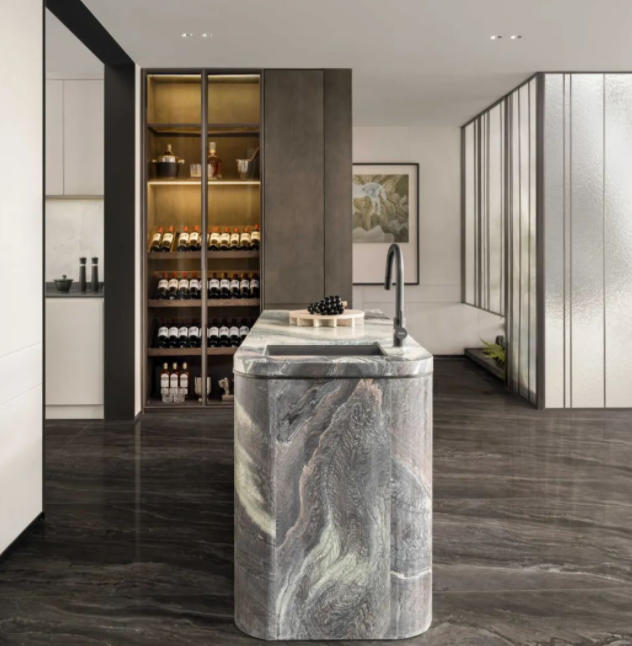 岛台如海水江崖,远观似山,近观似水。抽取蜀锦的元素,对传统纹样元素的延展,将海岸滩涂的纹理与粗粒颗粒质感结合。线面精致分隔餐厨区域,营造韵律感空间褶皱。