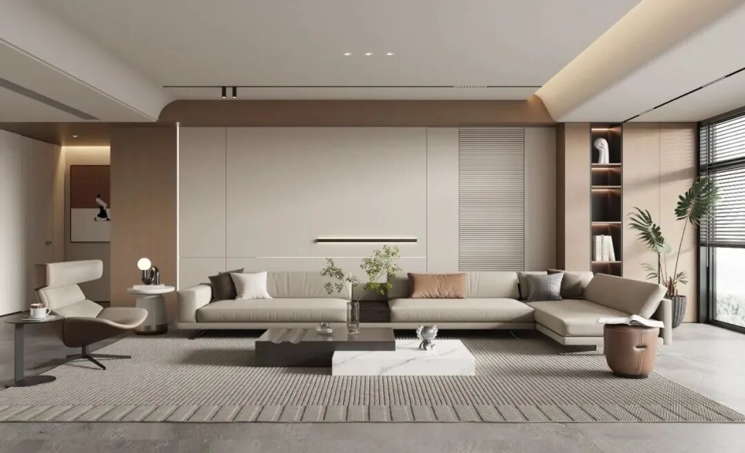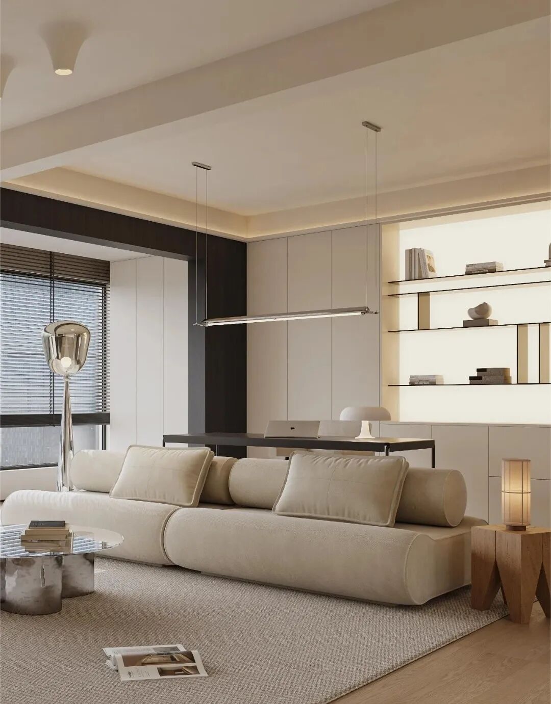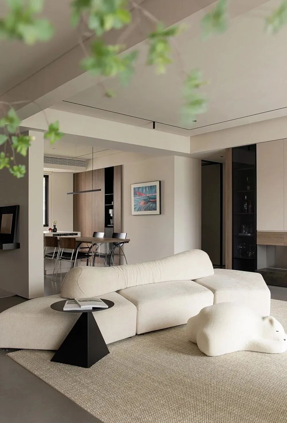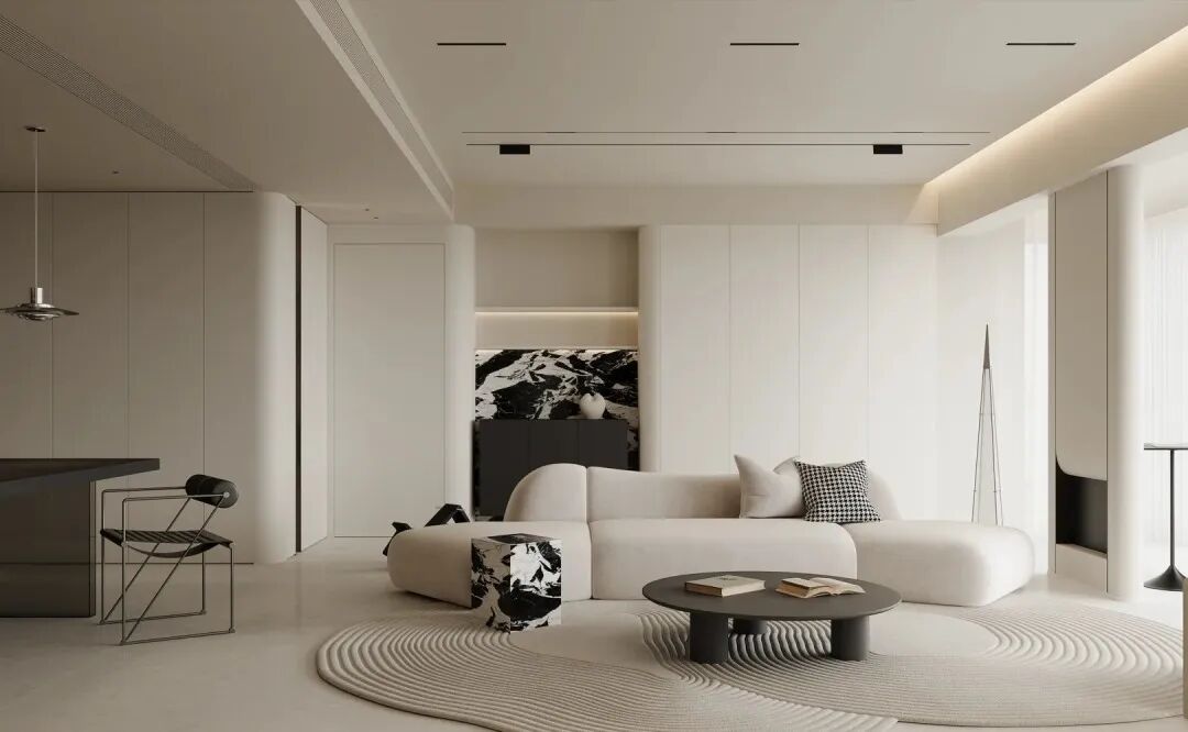 现代简约风格强调简洁的线条和形式,避免过多的装饰和复杂的图案。空间中的线条简洁流畅,无论是天花板的造型还是家具的轮廓,都以简单的几何形状为主。