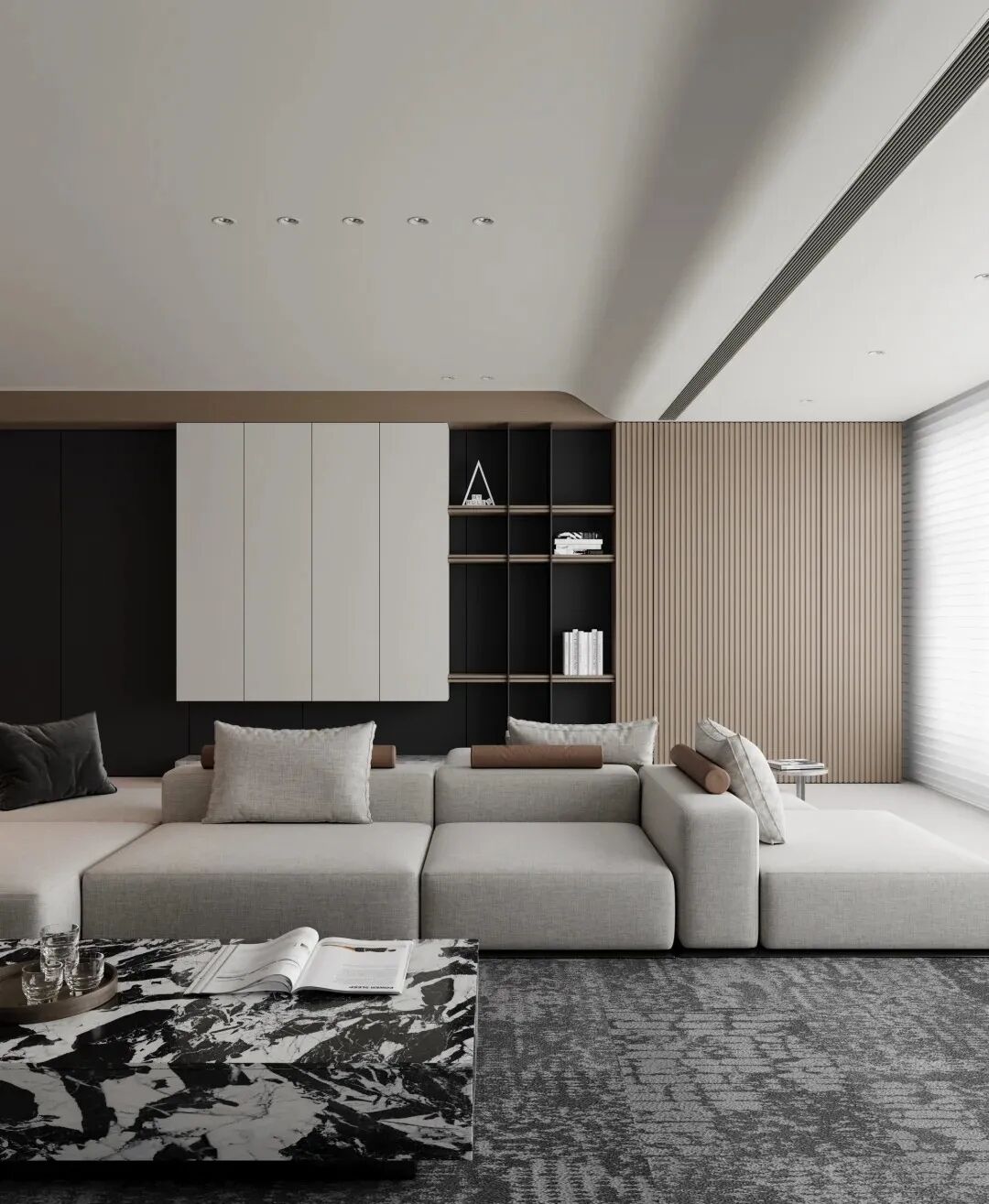 现代简约风格常使用中性色调,如白色、灰色和黑色,以及自然材料,如木材、石材和金属。