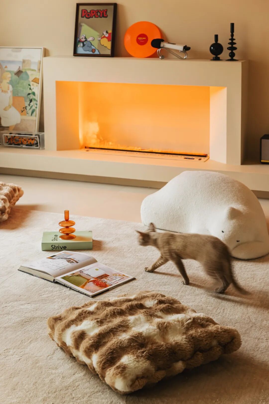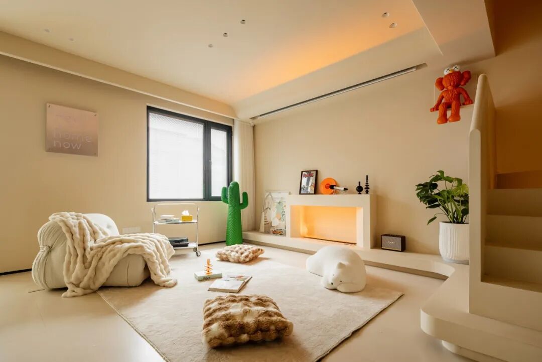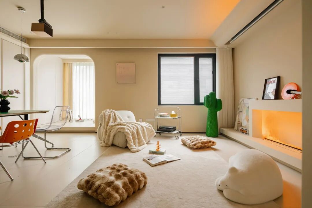 奶油色系低饱和客厅,墙顶一体更显完整,极简壁炉增加层次,吊顶安设投影幕布,家庭影院随心享,契合屋主喜好。