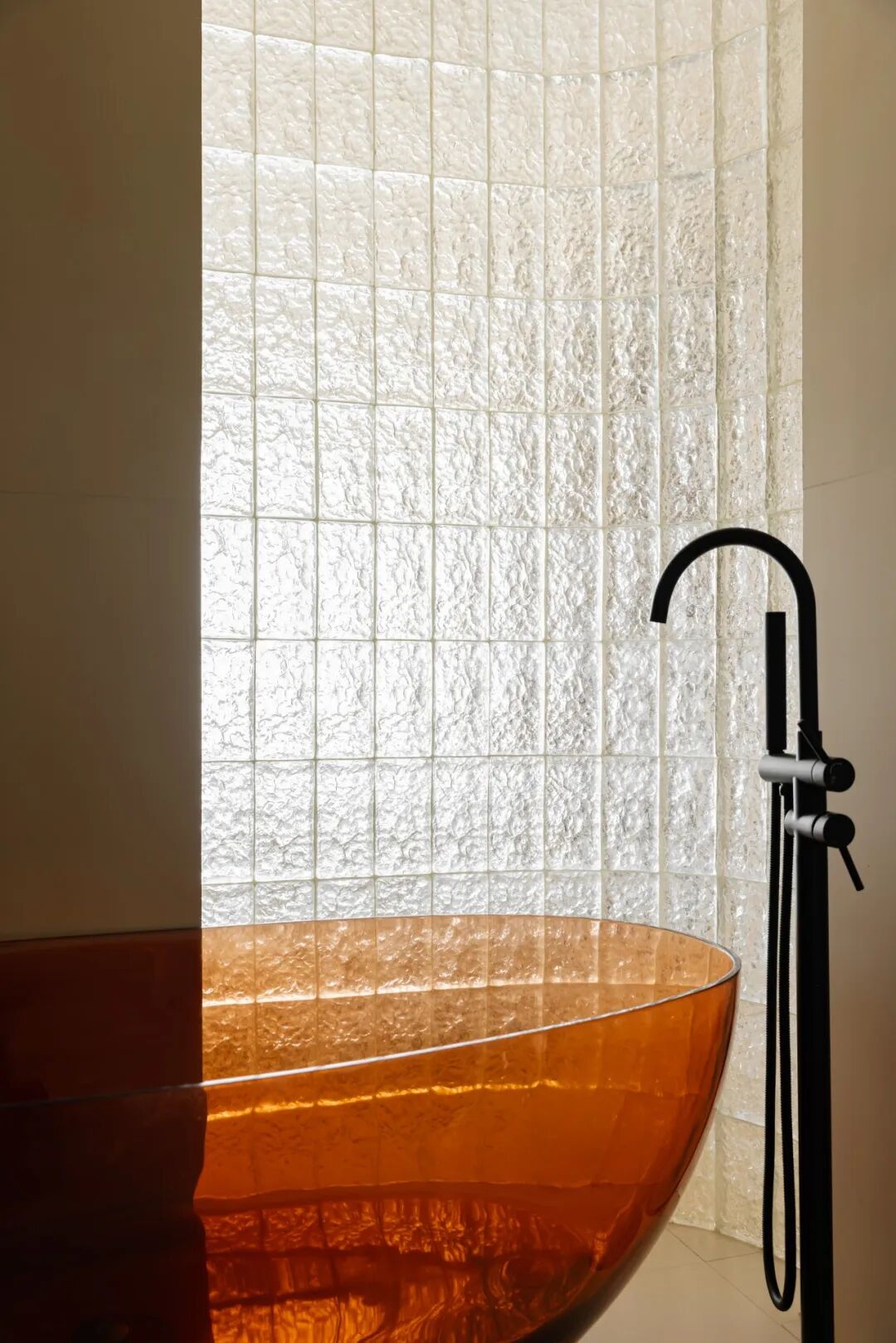 主卫玻璃砖透光护隐私,明间设计通透明亮,茶色亚克力浴缸添仪式感,日常洗浴成享受时光。