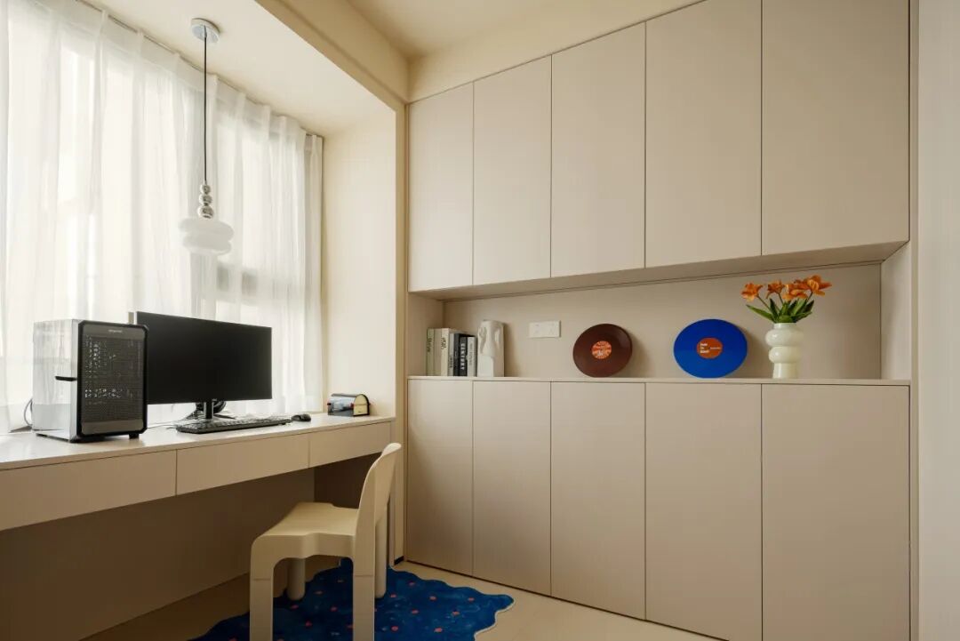 书房衣帽间合一,飘窗变书桌,抽屉式桌面增加收纳空间,采光佳护眼。侧墙满柜留空。用置物打造端景,美化空间。