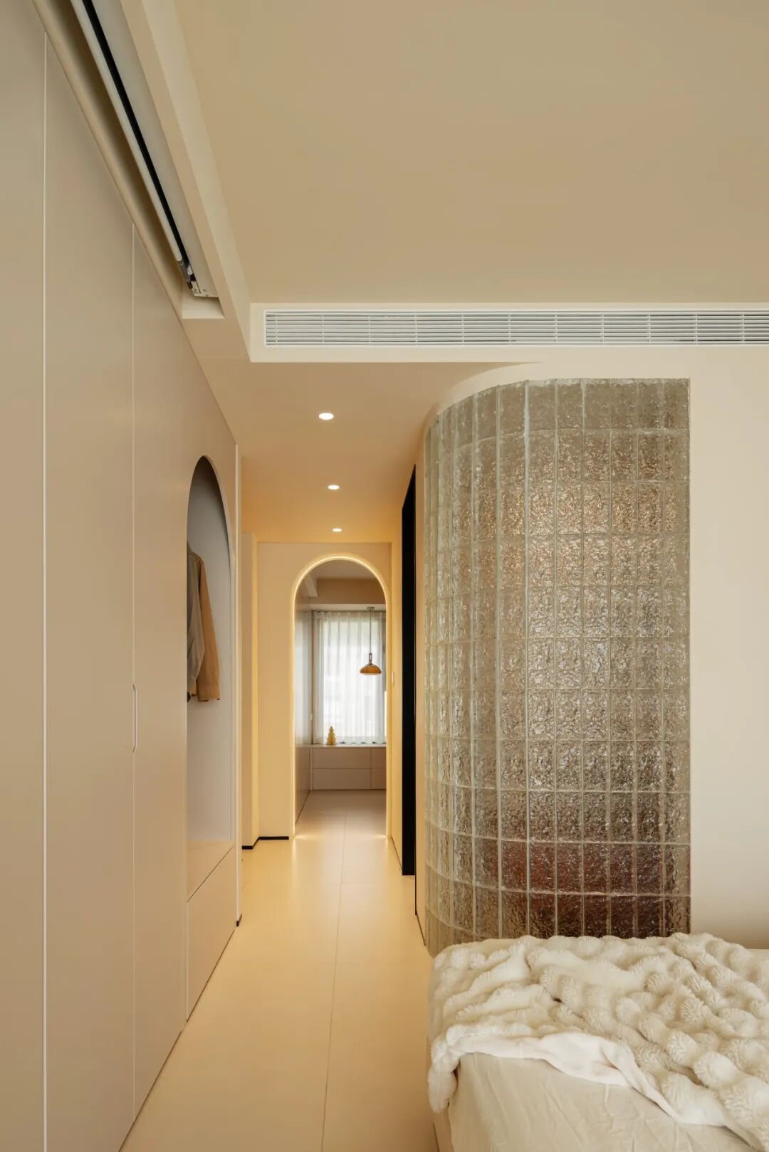主卫改横向,延伸入卧室,玻璃砖曲面收边防磕碰,压花纹理轻盈剔透,为卧室添精致梦幻氛围。