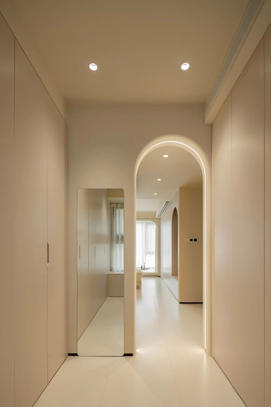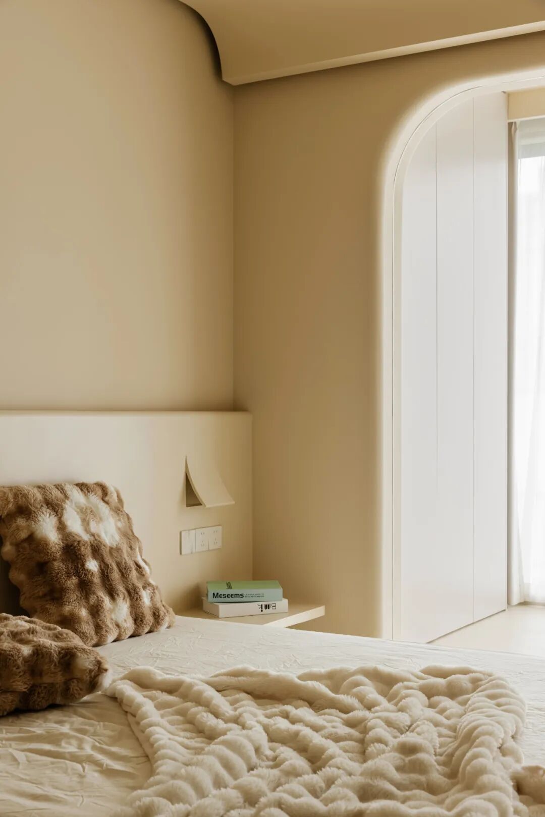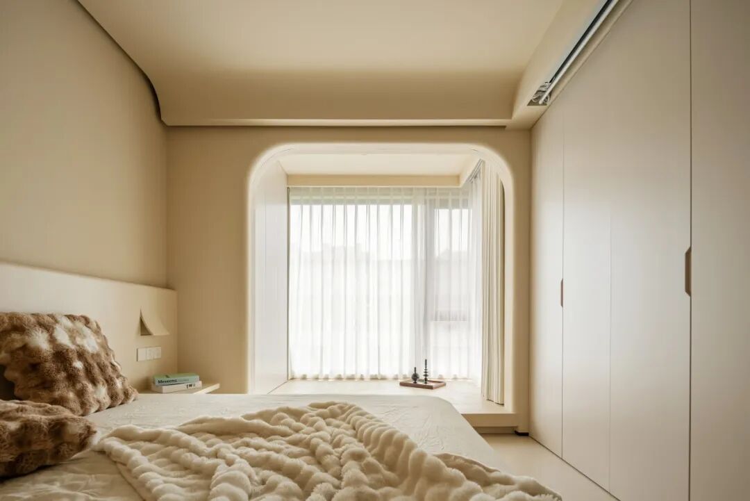 卧室吊顶至阳台以曲面衔接,留白缝隙增添呼吸感,层次分明。阳台侧定制收纳柜,利用墙体深度,美观实用并存。