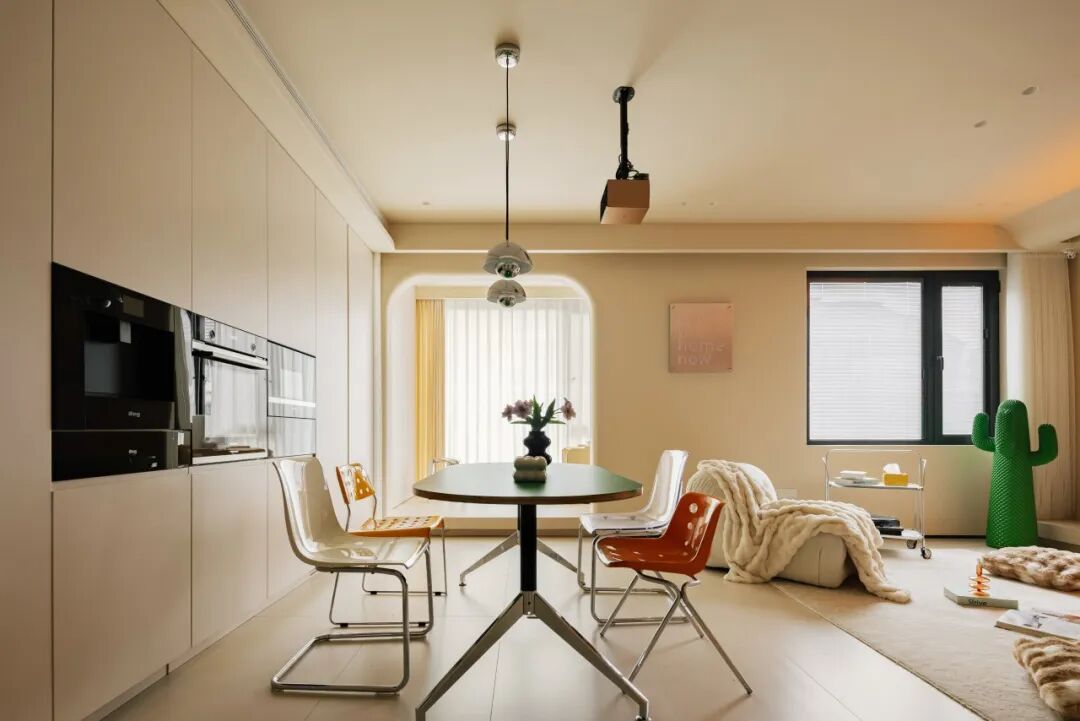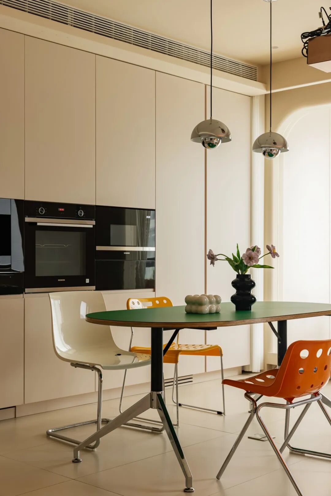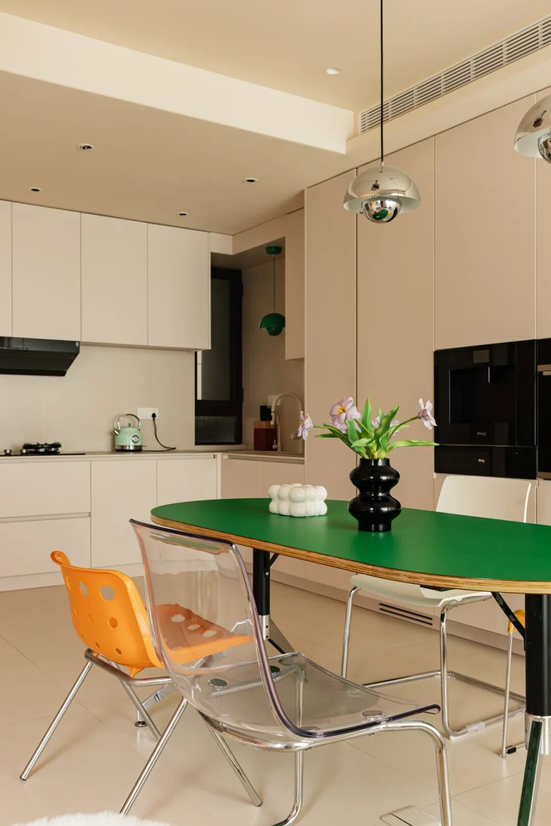 低饱和底色中,选用多彩餐桌椅:草绿桌配橙椅,融合多巴胺色系,展现屋主个性与积极的生活态度,营造缤纷的用餐氛围。