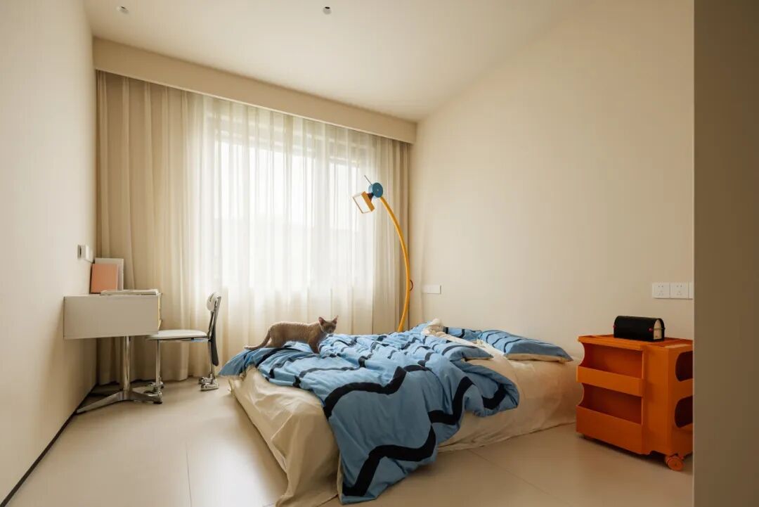 次卧备用,低饱和色调配上亮橙小几,增添活泼感,灵活移动,便捷实用。