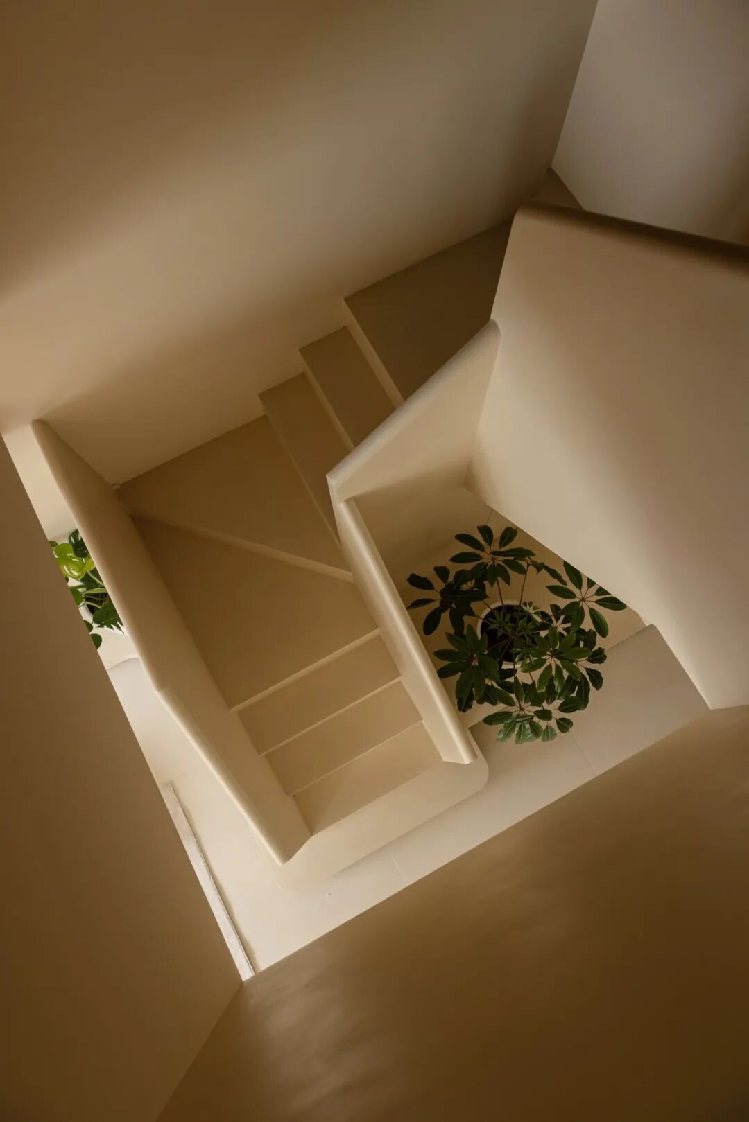 楼梯一体化设计,材质色调统一显得简洁,实用与美学为一体,侧置放地台绿植,色彩点缀空间,焕新家居活力。