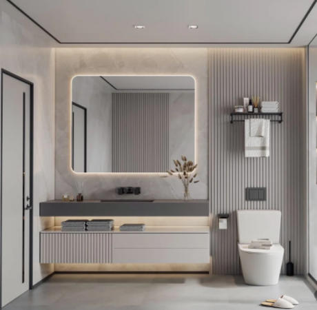 2. 遵循“7:2:1”色彩法则,70%面积用白色、浅灰等浅色系打底,奠定开阔、干净的基调;20%用木色、浅蓝等中间色点缀柜体、毛巾等软装,增加空间温度;10%用黑色金属、深灰等深色做五金件、灯具点缀,平衡色彩层次,避免单调。