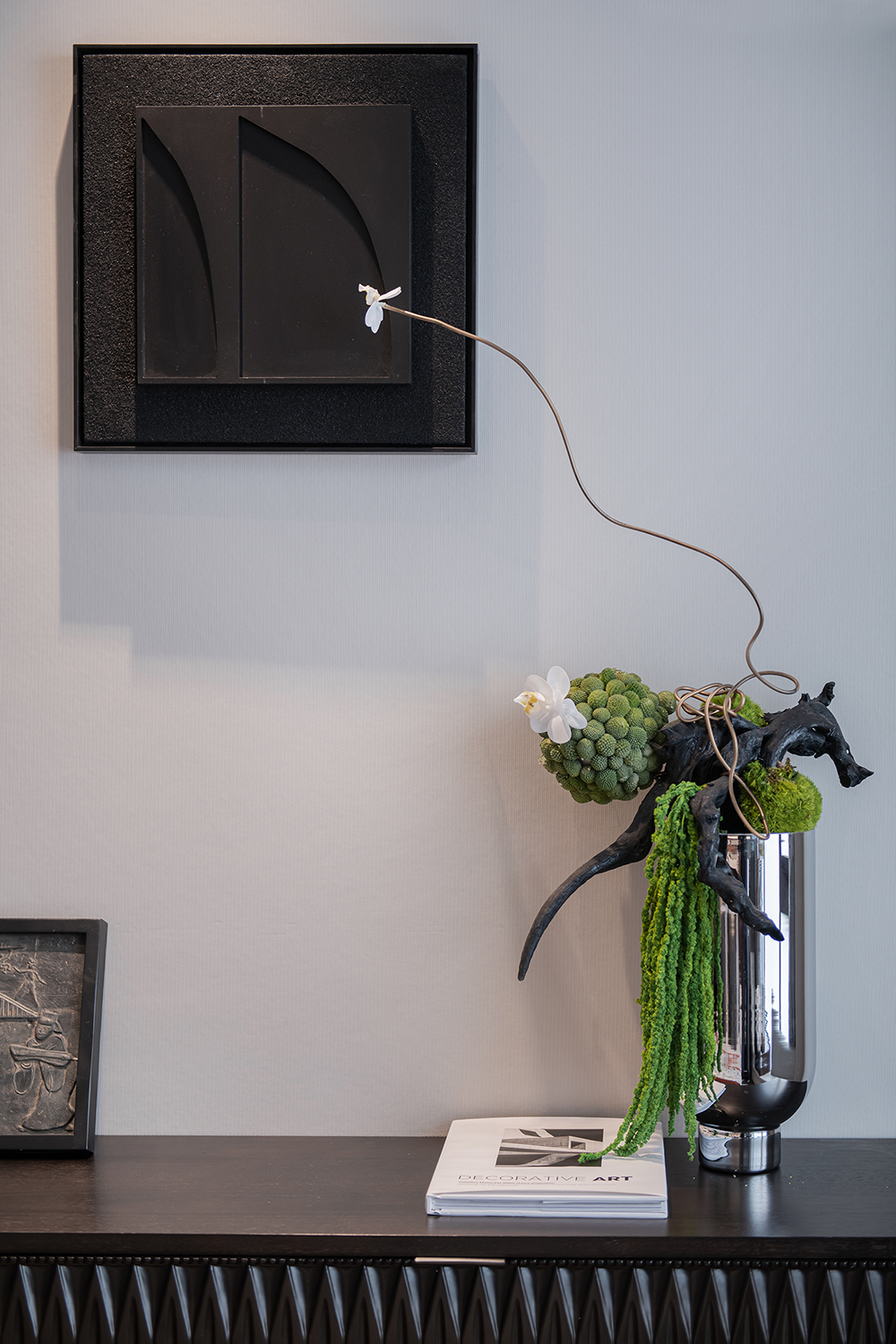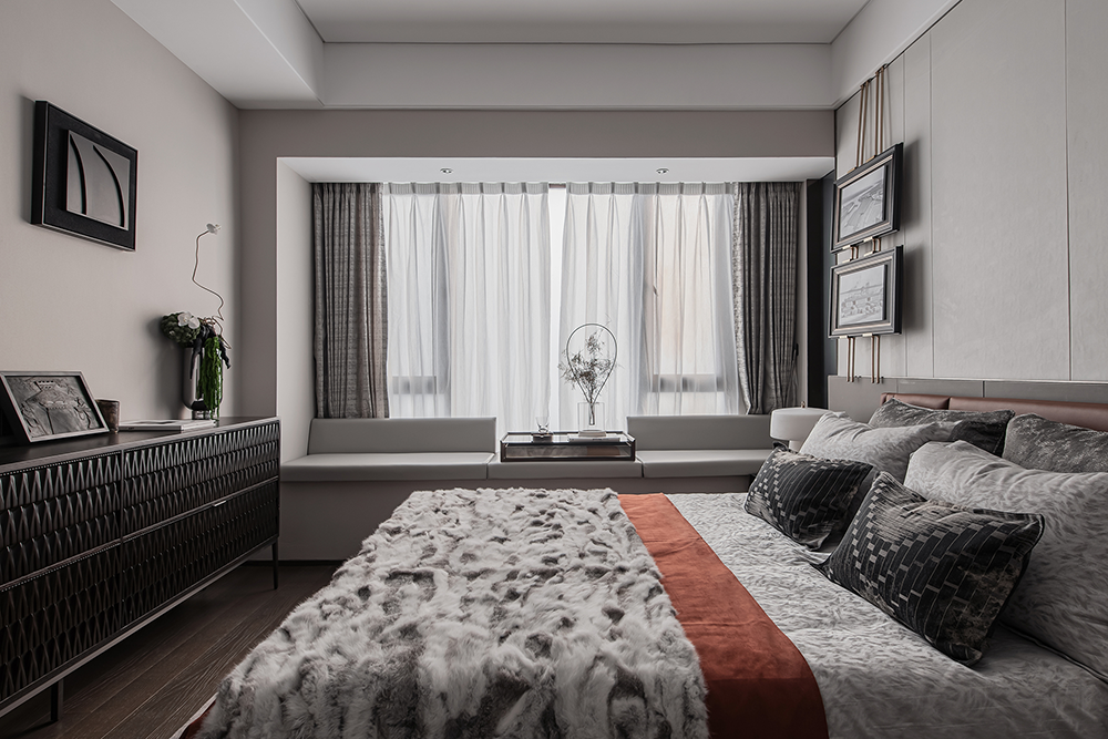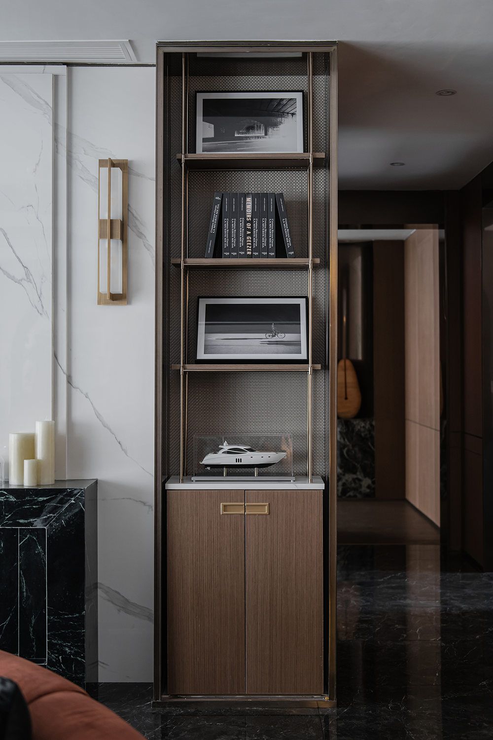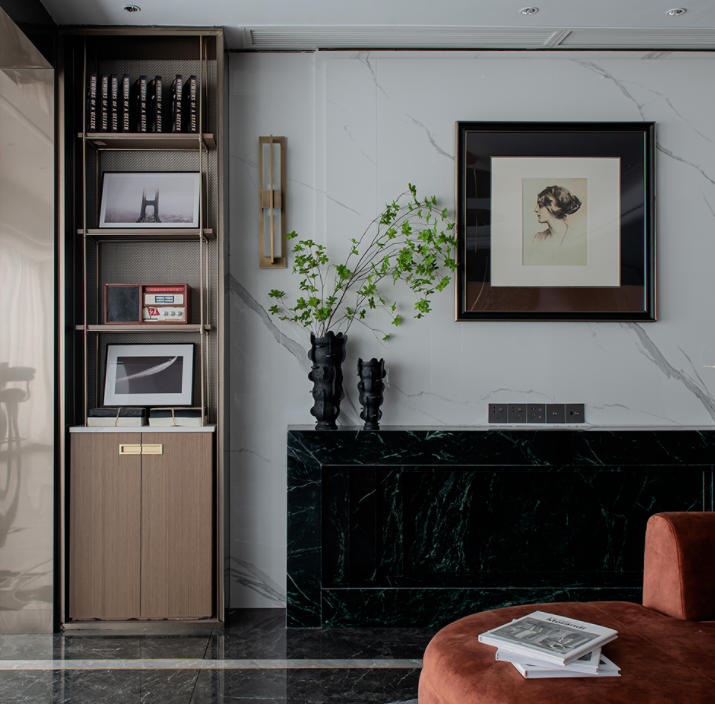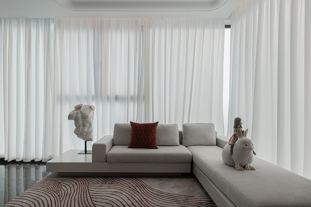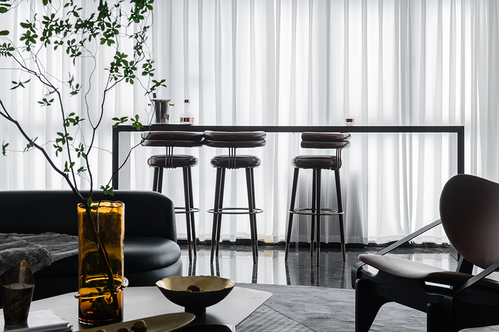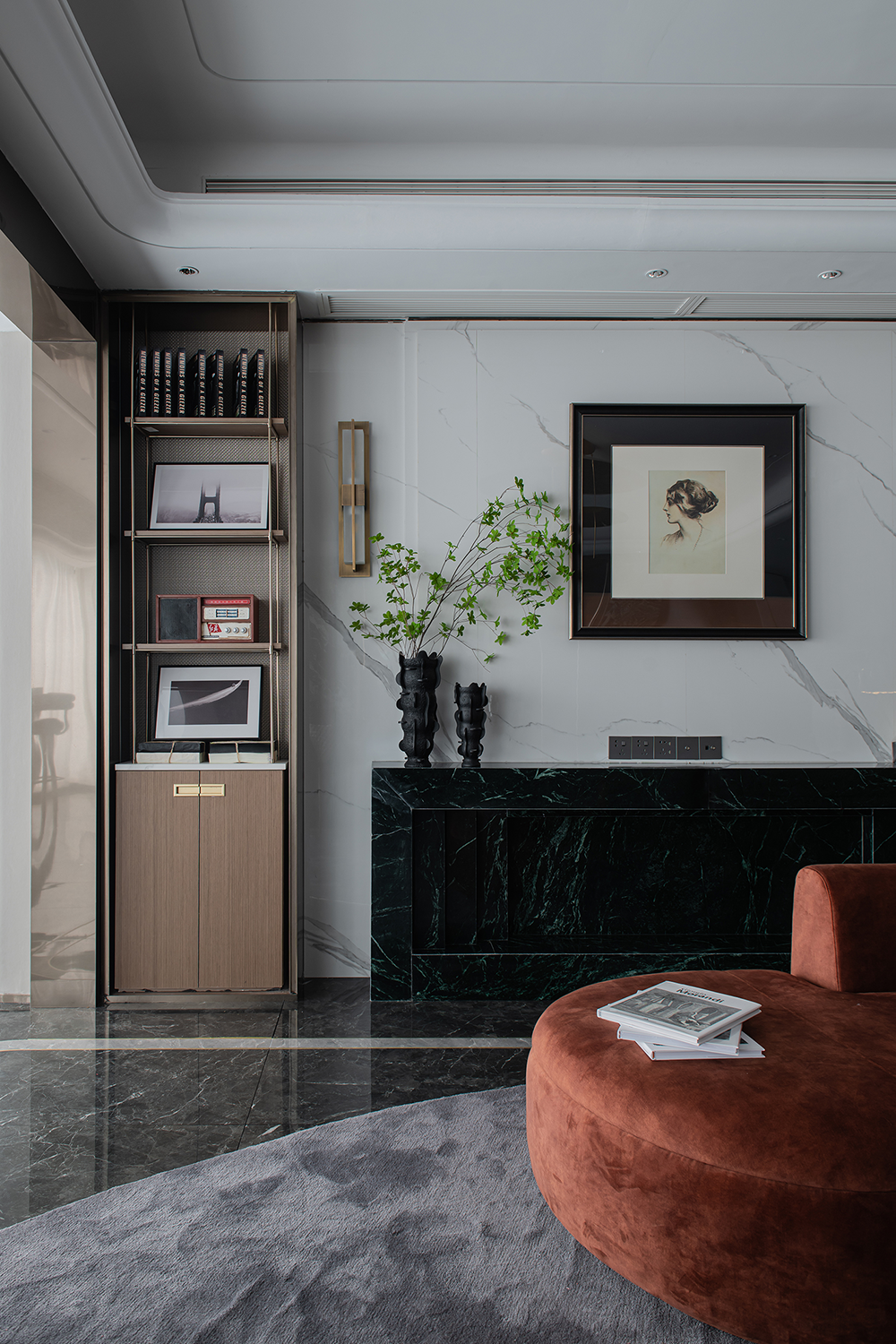 客厅每一个点、线、色、形、韵,是设计师以陈设艺术谱写的一段五重奏,前景、中景与远景构图,层次丰富,线条利落。