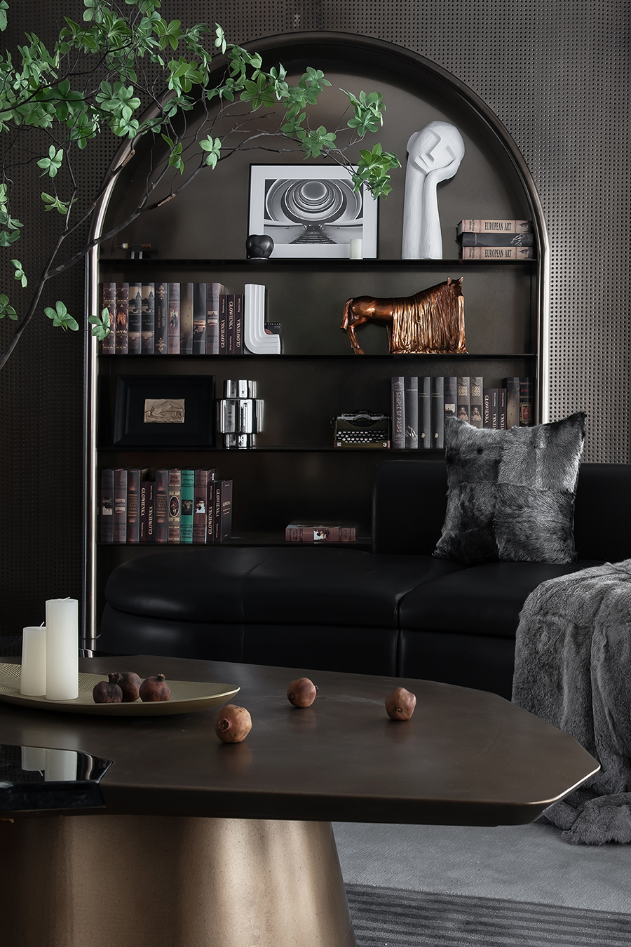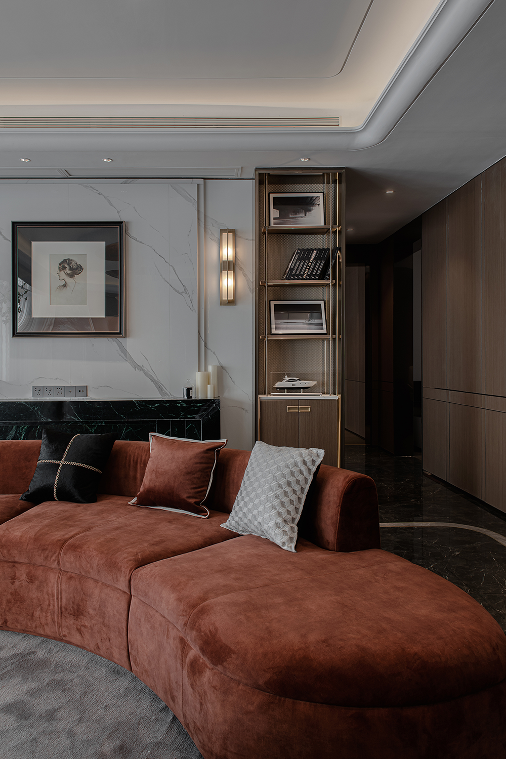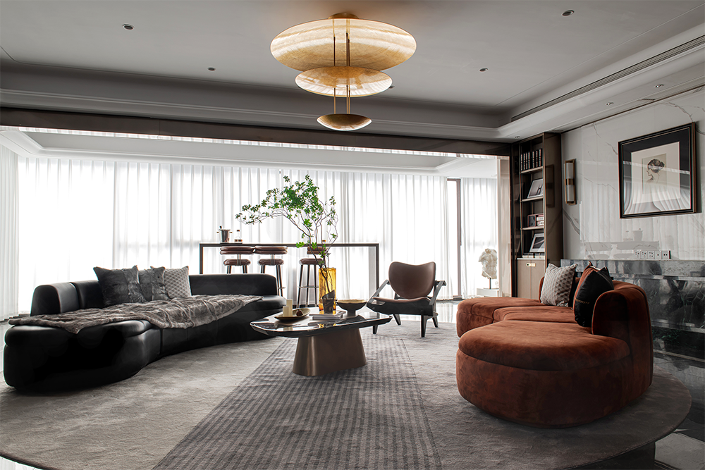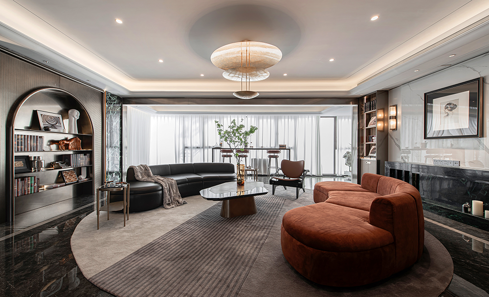 客厅运用沙对坐方式,以海派室内布局,选用包裹性很强的弧形沙发家具BAXTER,黑色皮革与生俱来的神秘魅惑,红棕色天鹅绒自带的优雅简约,低调奢华之间又蕴含无穷的底蕴。