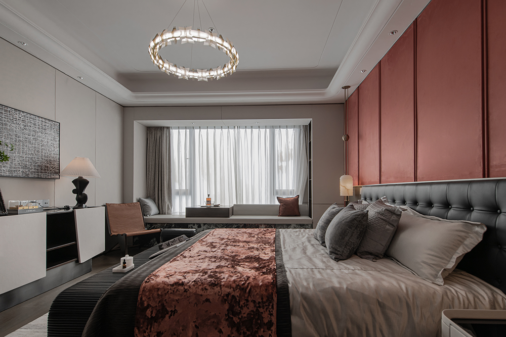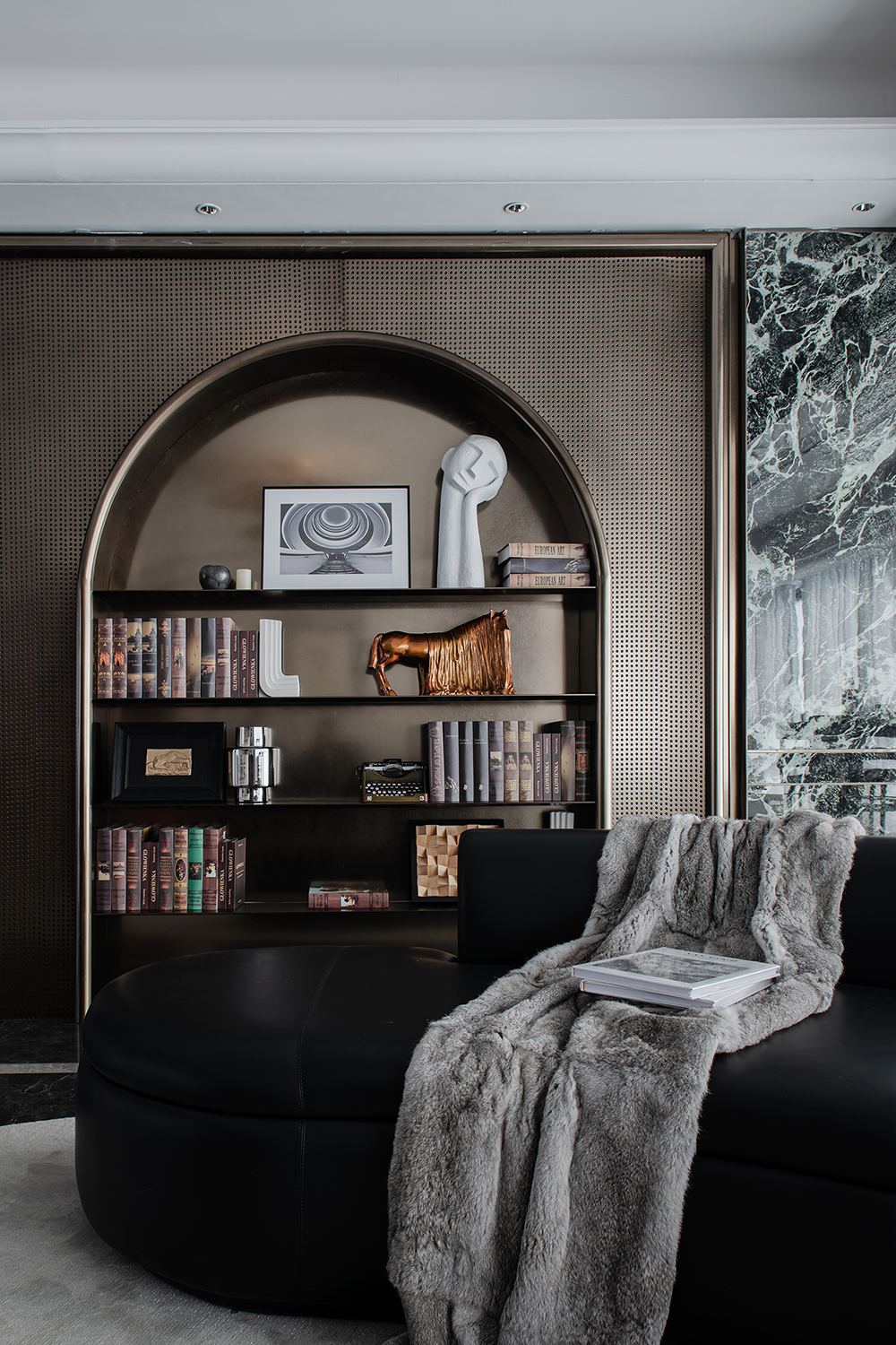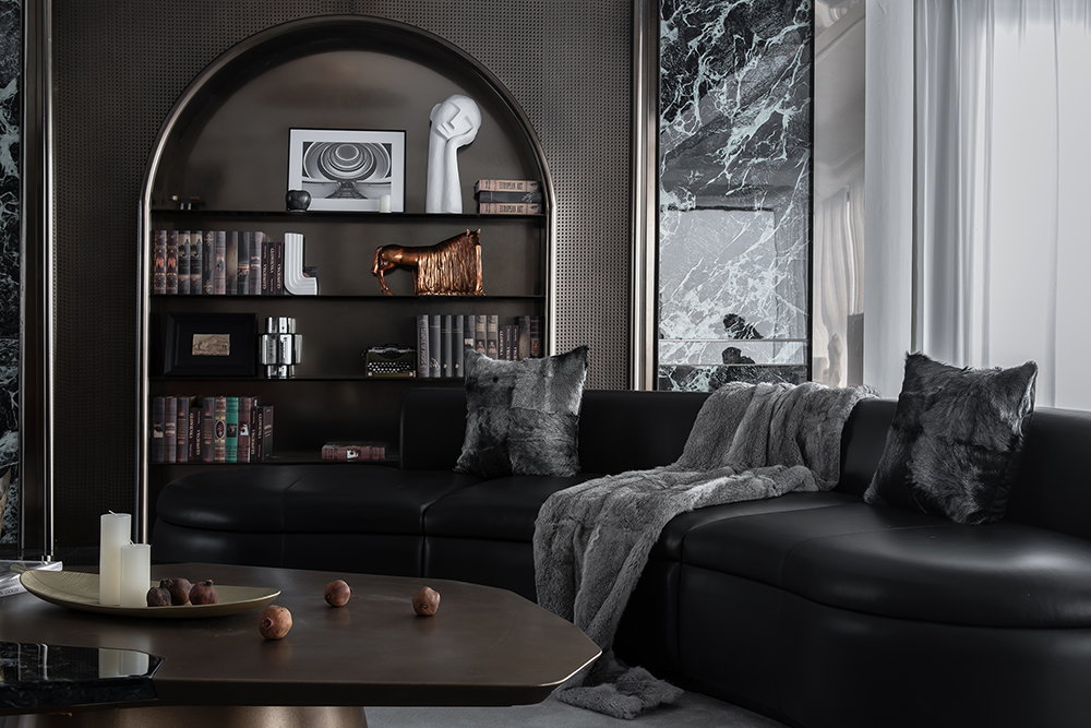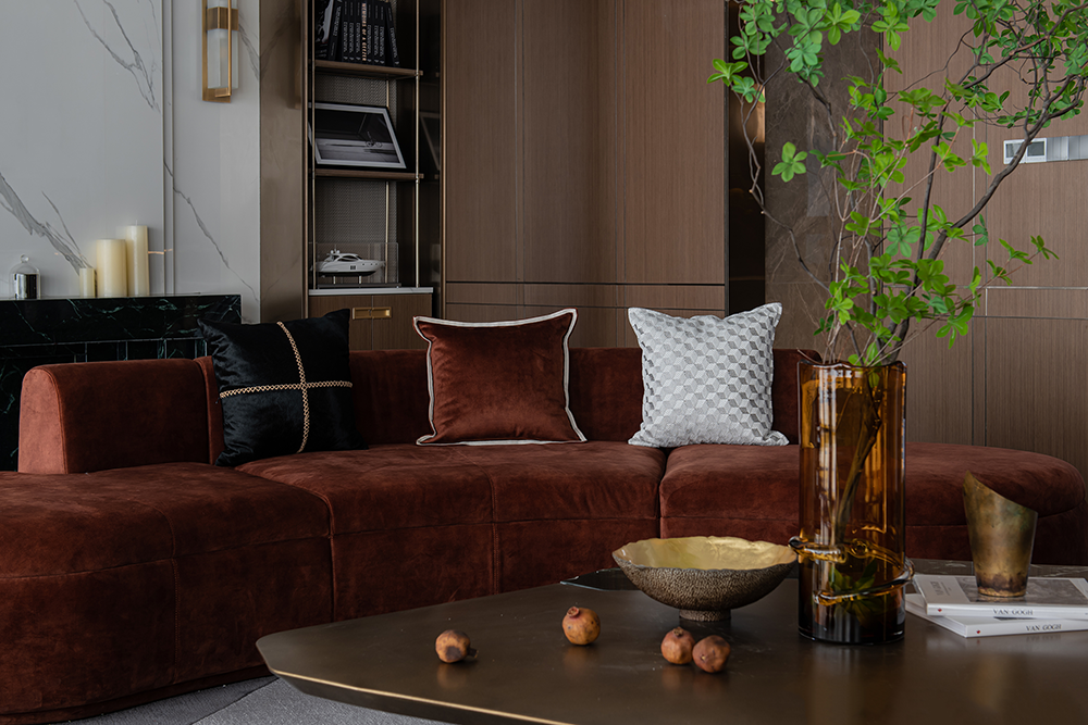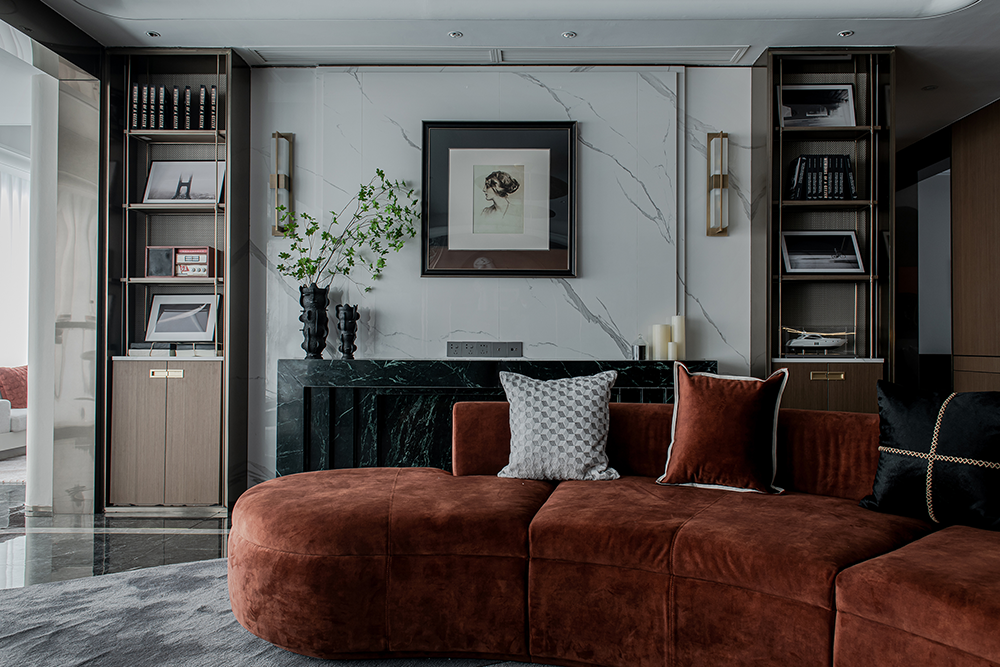 客厅运用沙对坐方式,以海派室内布局,选用包裹性很强的弧形沙发家具BAXTER,黑色皮革与生俱来的神秘魅惑,红棕色天鹅绒自带的优雅简约,低调奢华之间又蕴含无穷的底蕴。
