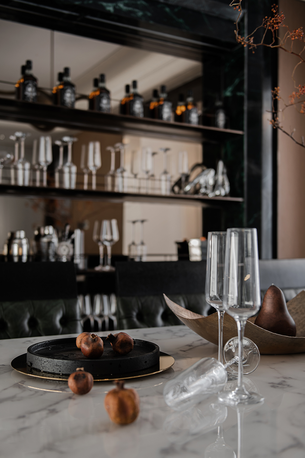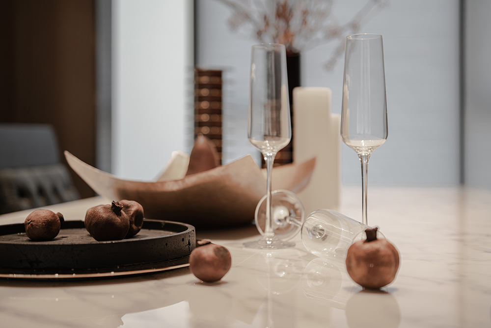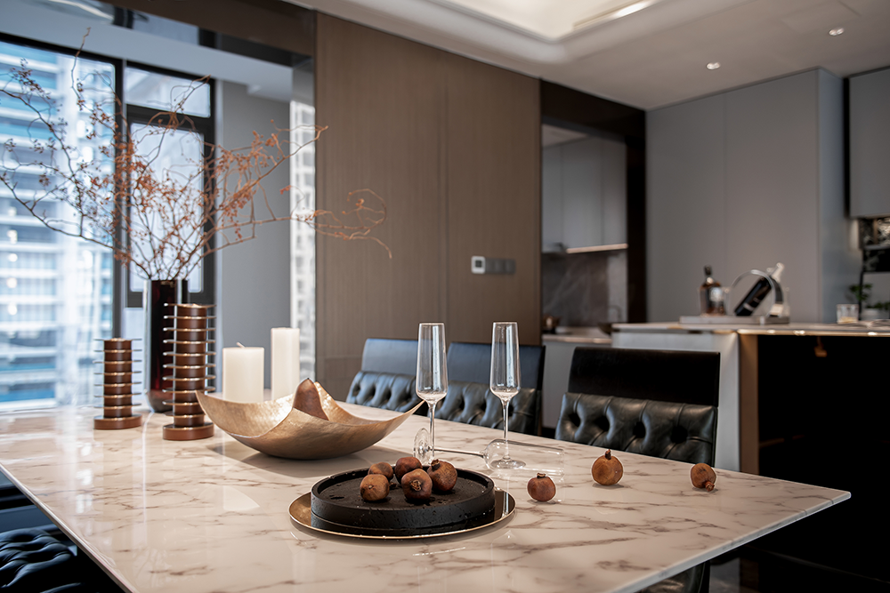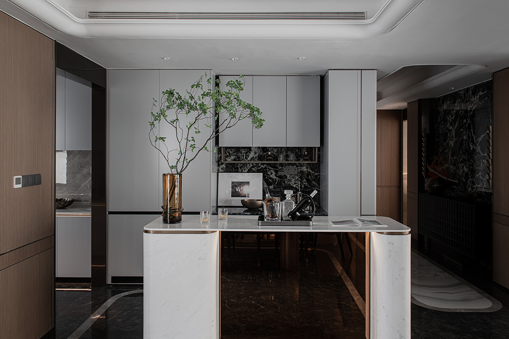 岛台环绕,双洄游动线,线条曲直并行,材质刚柔搭配,精致淬炼成白雪与黄金,遵循高阶餐桌礼序,满足理想生活仪式。
