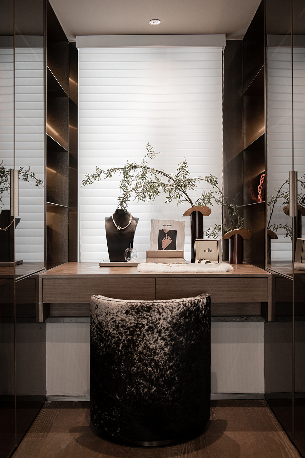 步入式衣帽间,木饰隔板与金属挂件将衣帽间简洁合理地划分,设计选用淡雅影木,线条流畅简洁,充满情调,同时考究整体灯光、色调和材质等搭配而呈现,显露出细节品质感。