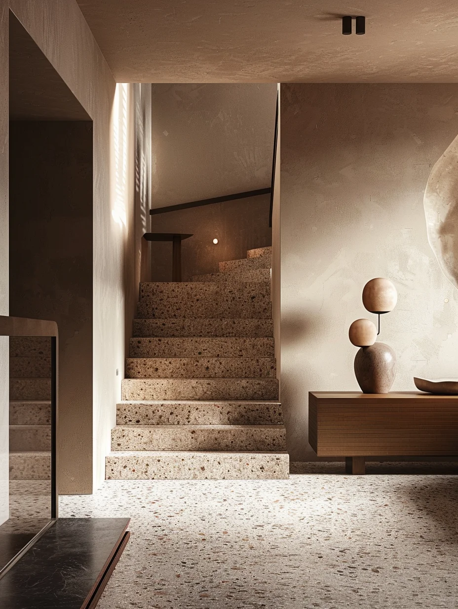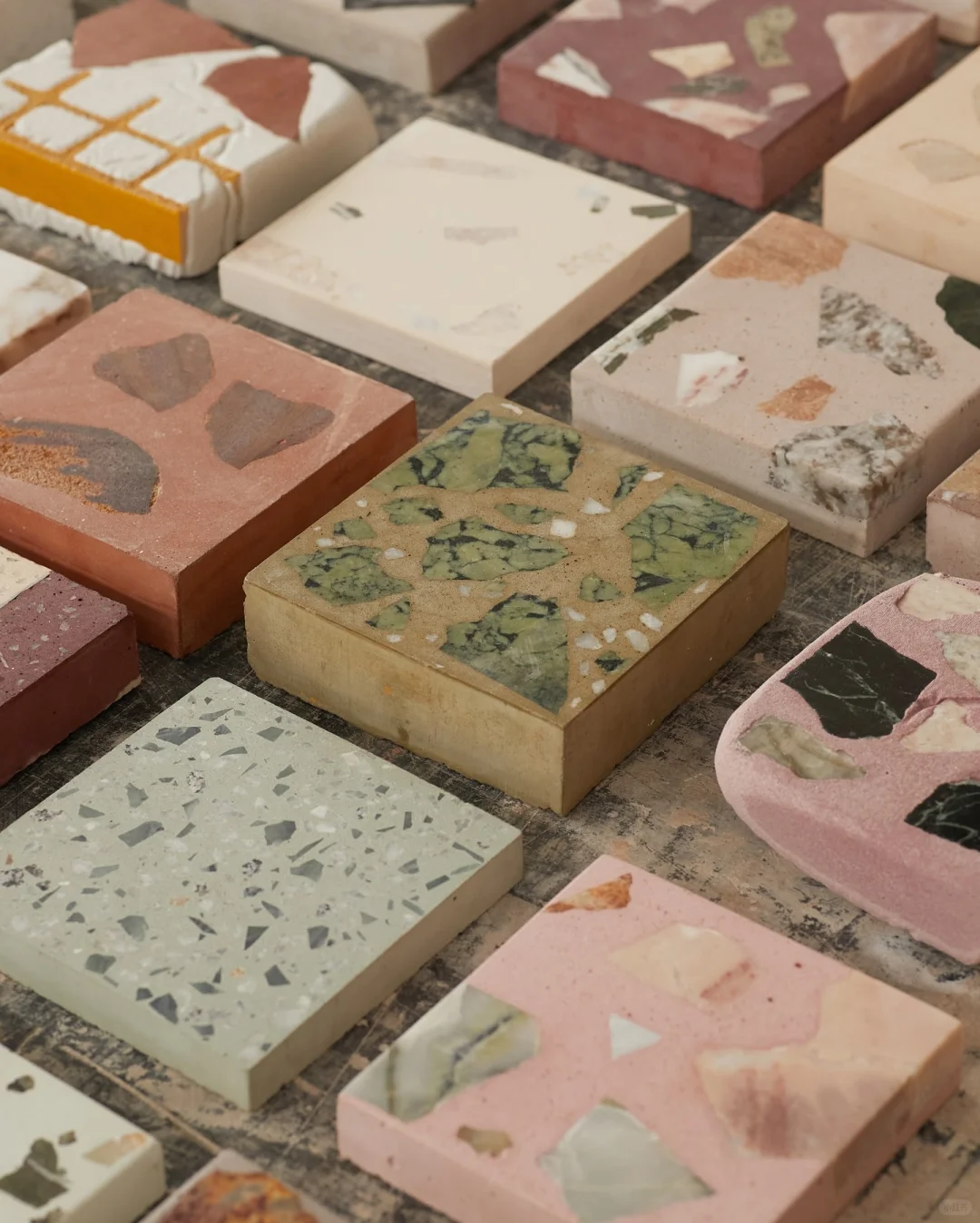 水磨石是一种由碎石、玻璃或石材碎片嵌入水泥或树脂基材制成的经典材料,近年来因其复古与现代兼容的风格而再度流行。而石材边角料废物也成为制作水磨石的绝佳原料。