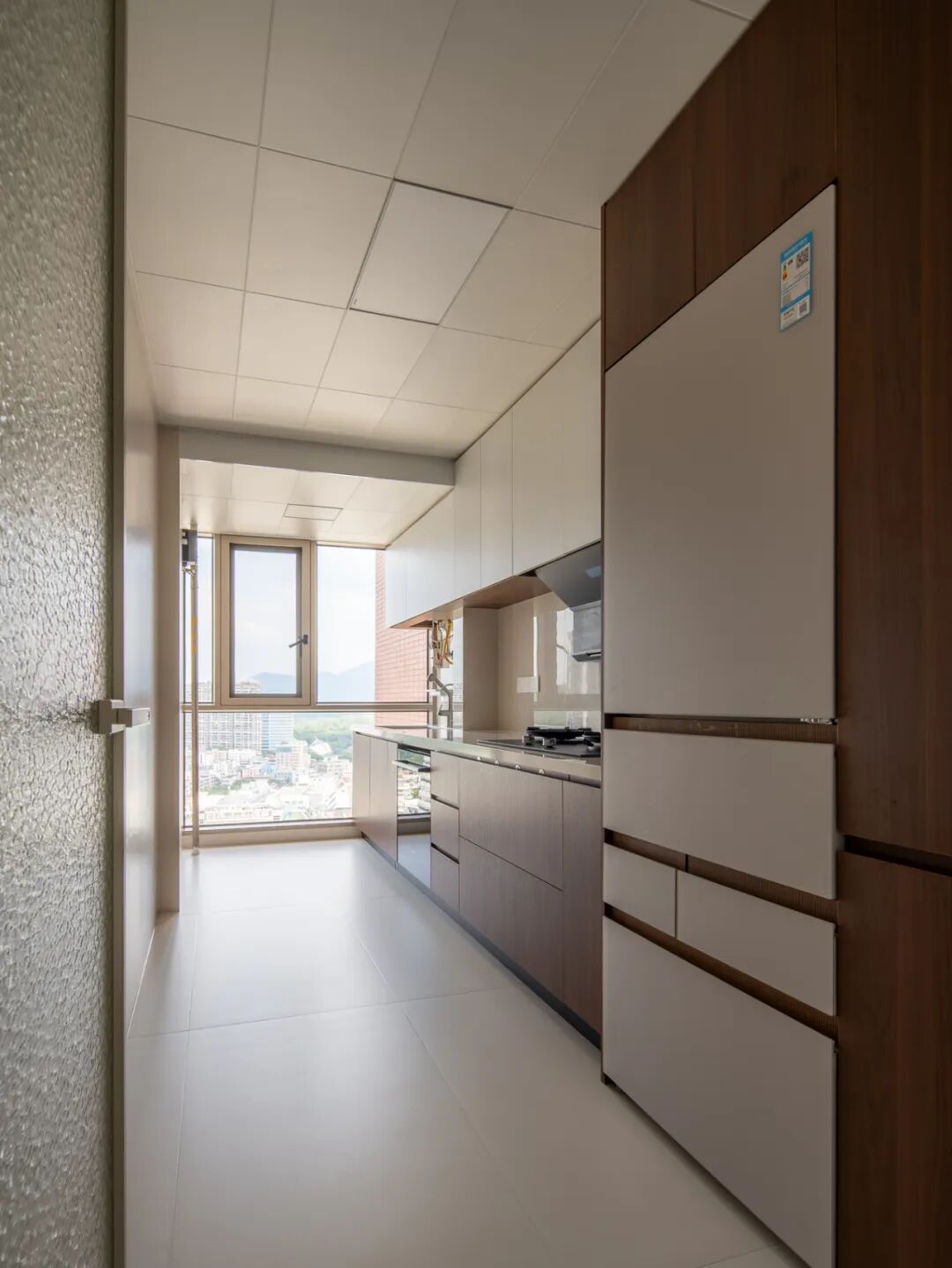 1.厨房的“尺寸精准控”,厨房台面+吊柜的布局,结合了“操作动线”(洗-切-炒),同时预留了“冰箱嵌入位”,没有让冰箱凸出来占过道空间,让厨房过道更通畅。