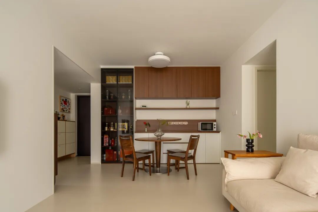 上方的简约灯具洒下柔和光线,为食物与交谈镀上温暖滤镜;一旁的餐厨区,木质吊柜与开放层板的组合,让收纳也成了美学的一部分。