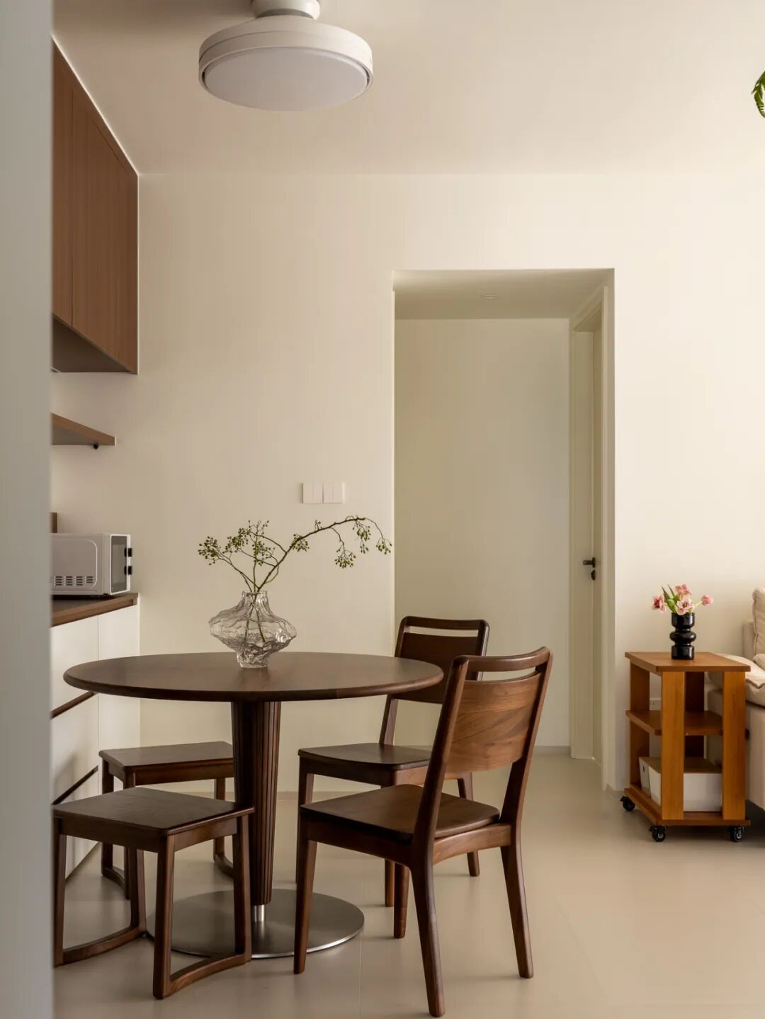 用木质家具的天然肌理呼应生活的本真,以玻璃花器的清透、绿植的鲜活点缀,打破极简的冷寂。