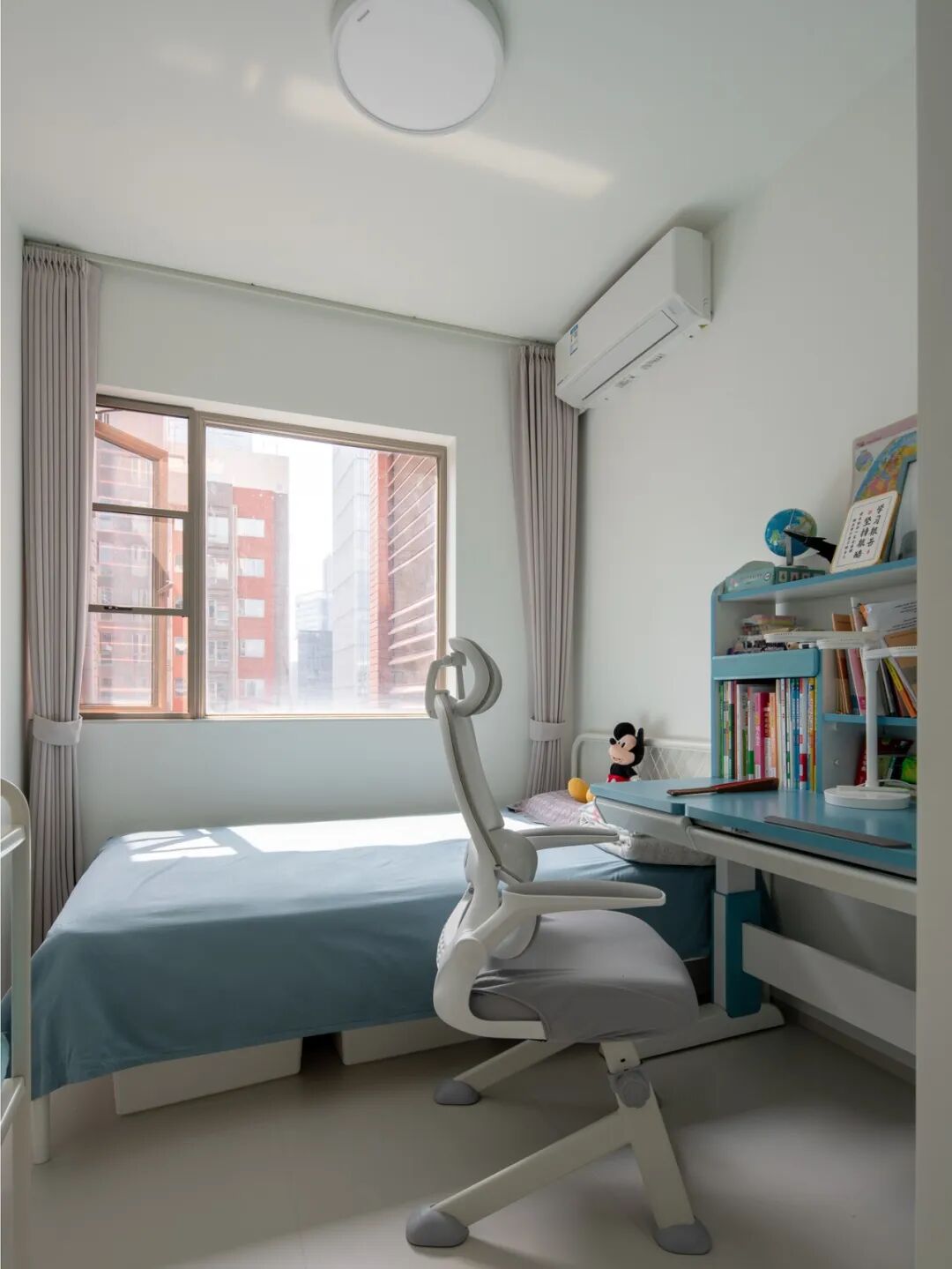 浅蓝床品铺就温柔梦乡,可调节学习椅守护坐姿,蓝色书桌堆满书籍与童趣小物,每一处都为孩子的 “学习 + 玩耍 + 休憩” 量身定制。