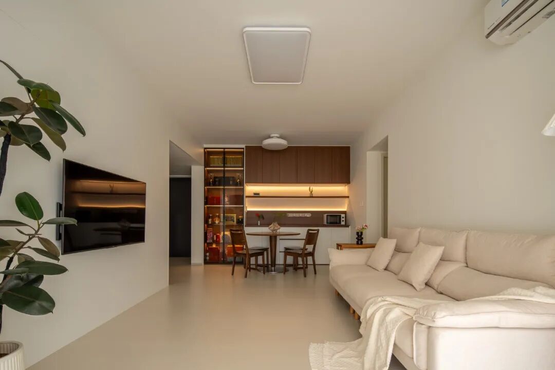 总结:本案是一套简约柔和的轻侘寂风,以大面积的奶白、浅杏为主色调,搭配温润的胡桃木色家具做点缀,既保持了空间的通透整洁,又通过木质元素增加了暖意。 设计上很注重 “实用与颜值兼顾”, 整个家没有复杂装饰,却靠柔和的色彩、统一的材质和充足的采光,营造出松弛又治愈的日常感,很适合追求舒适与整洁的居住需求。