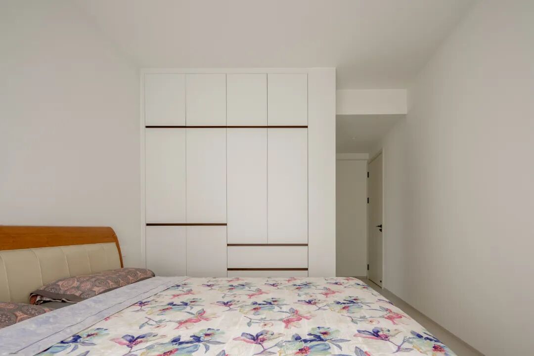 ▌大面积白色衣柜采用木质线条点缀,在极简中融入质感细节,满足衣物收纳的海量需求;床头的木质与软包结合,兼顾美观与舒适,床品的花卉图案为空间注入生活的鲜活气息,整体营造出 “舒展且有温度” 的休憩场域。