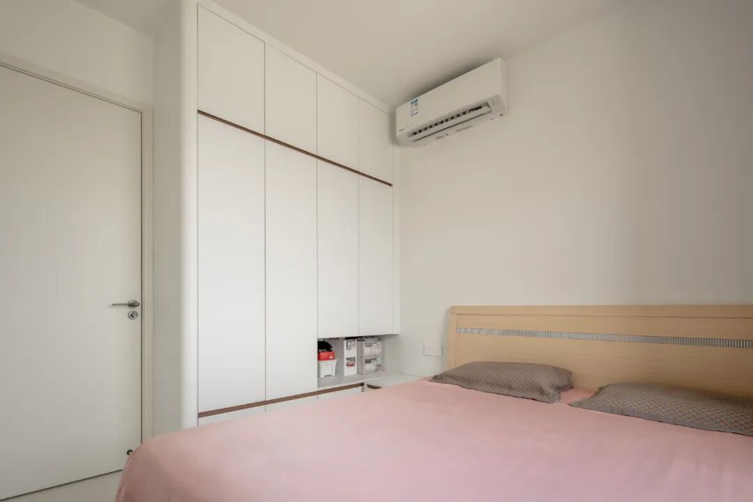 ▌次卧走精致实用路线,定制衣柜利用角落空间做到 “顶天立地”,同时在柜体下方开辟开放收纳区,方便日常小物存取;浅木色床头简约利落,粉色床品柔和温馨,空调布局合理不压抑,在有限空间里实现 “功能与温馨的平衡。”