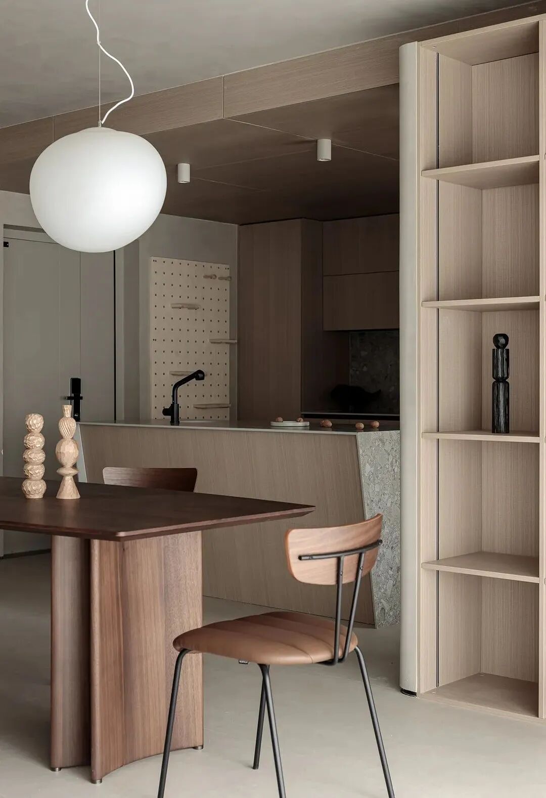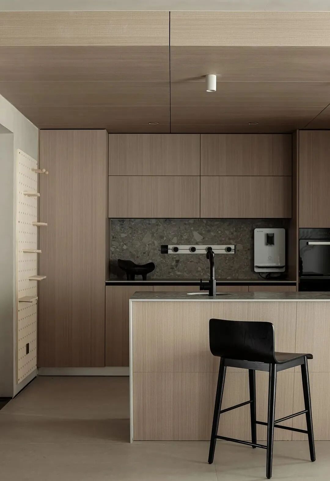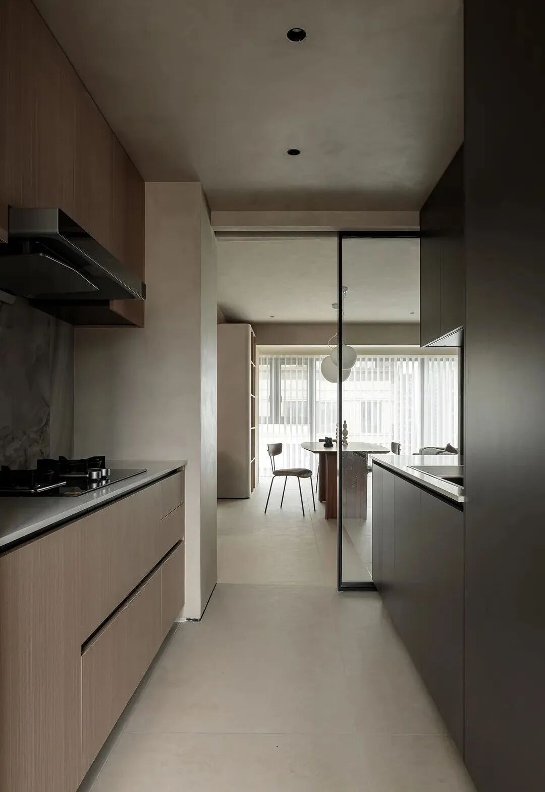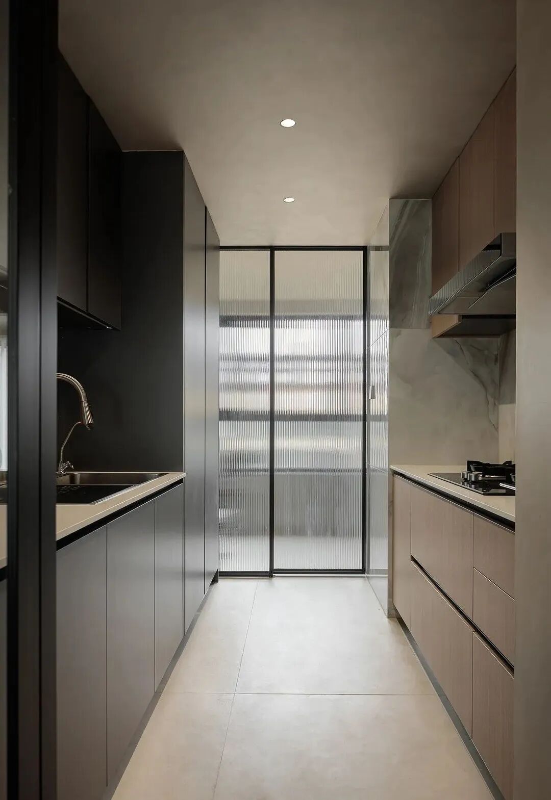 改造前:1.原户型的整体空间分割较为密闭,缺少通透感2.进门通道处空间感狭窄,限制使用面积3.阳台与客厅之间的墙体有碍视线,影响空间通透性改造后:1.拆除进门通道处的隔断墙体,合并空间,使整体视线更加开阔2.玄关与原有客房空间连贯3.第一空间作为休闲、餐饮使用,设计为西厨和茶室空间4.茶室空间运用推拉门隔离,即可开敞,又可私密5.连通生活阳台与客厅,扩大公共空间使用范围6.原阳台区作为活动空间使用,满足日常健身器械使用7.扩大主卧空间,将卧室、衣帽间、卫生间连通,使空间连贯玄关作为第一空间,内与外、快与慢均由此界定。将过道空间与西厨吧台链接,可直达茶室区域,将定制与生活严丝合缝,使空间拉伸感更加明显,同时又显得时尚高端。客厅整体空间以极简大方为主,客厅与阳台打通引入自然明亮的采光,电视墙以定制造型设计,让客厅显得简雅大方而舒适。沉静的灰咖色调场景中布置上精致舒适的家具软装,并加以文雅艺术的小细节饰品布置,彰显优雅的高级设计氛围。厨房设立了开敞西厨吧台和传统厨房相结合,调烹、吃食,动线明了,使餐饮空间也可以是多变的、灵动的、随性的。不仅为主人提供了一个现代时尚而方便的烹饪环境,西厨吧台让用餐空间更加时尚精致而文艺高级,整体提升新家格调,低调奢华,营造极具氛围感的用餐氛围。餐厅餐厅与客厅空间连通,风格保持一致,采用开放式设计,增加空间的通透感,提高房间的透光效果。布置装饰品使得用餐氛围精致优雅而大气,去繁留简,常见的线条和几何图形的交织将空间个性展现出来。卫生间卫生间的设计符合现代的前卫感,将空间利用率最大化,保证实用方便的功能性,日常显得干净整洁。卧室尽可能不用装饰和取消多余的东西,以简洁的造型、纯洁的质地、精细的工艺为其特征。通过软装的配合显示出美感,营造出安静的氛围,让看上去明朗宽敞舒适的家,来消除工作的疲惫,忘却都市的喧闹。书房采用推拉门隔离空间,隔离喧嚣,享受闲暇。静坐,沏一壶香茶,细品静观,久远清香。进入空间是独处的自我时刻,推门出,则是生活。
