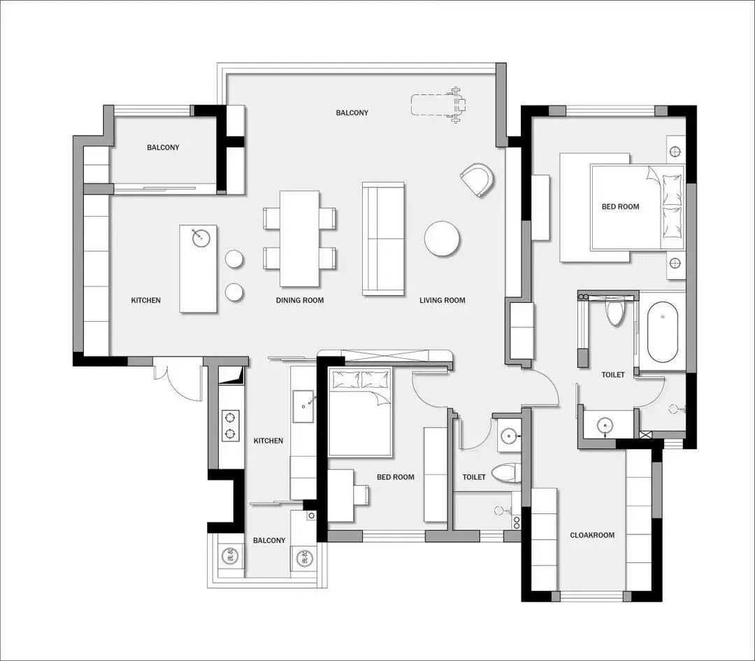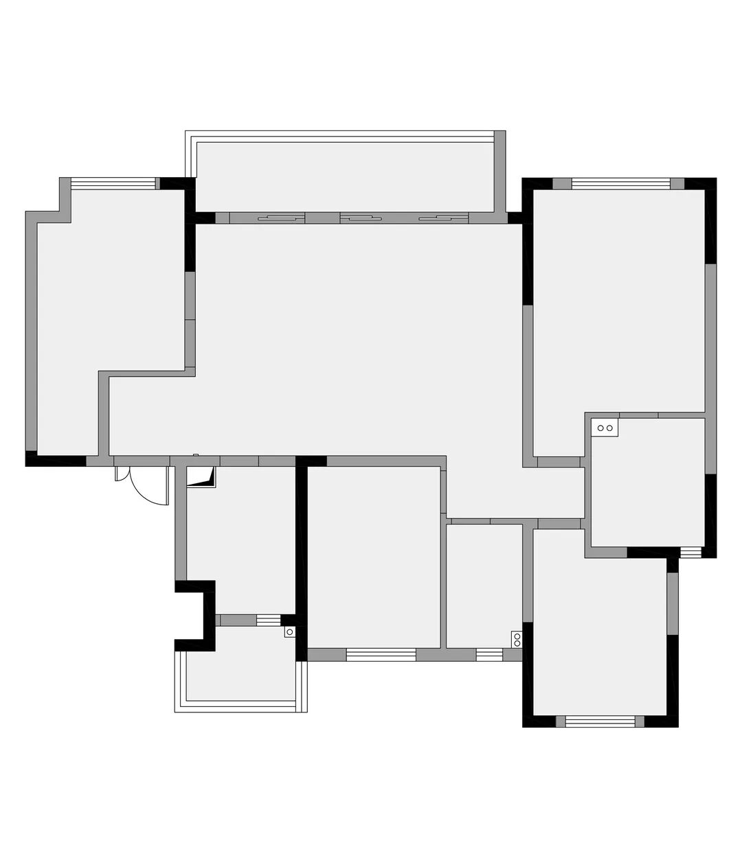 原户型的整体空间分割较为密闭,缺少通透感,进门通道处空间感狭窄,限制使用面积;阳台与客厅之间有墙体隔断,有碍视线,影响空间通透性。业主对于生活品质有较高要求,满足实用功能的前提下,彰显空间格调。