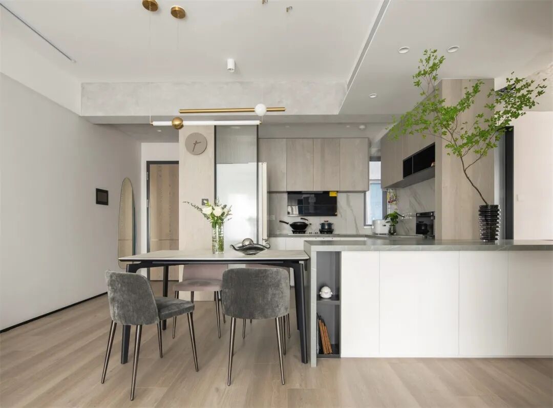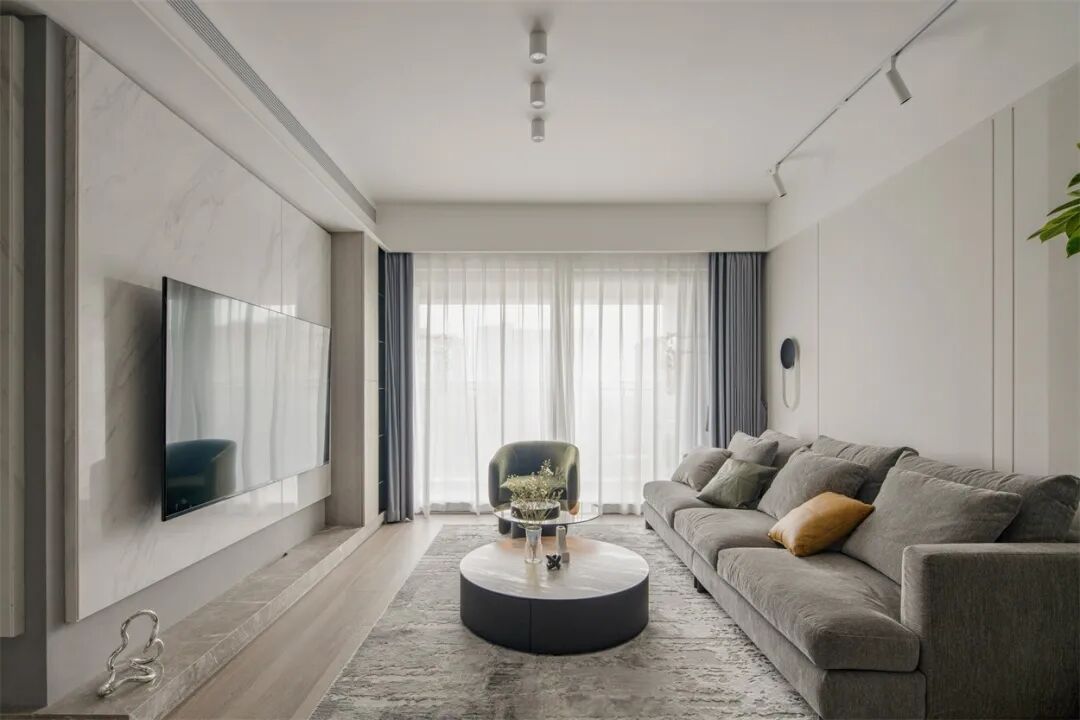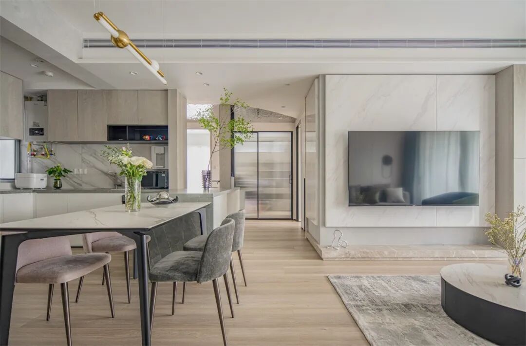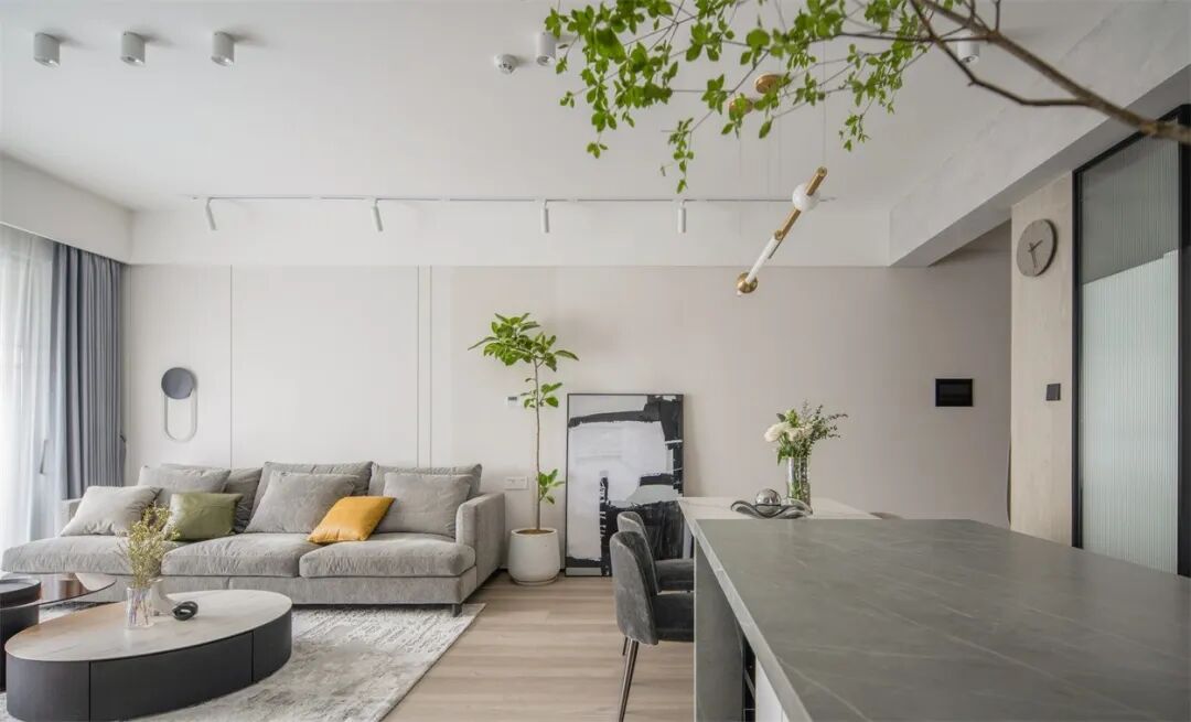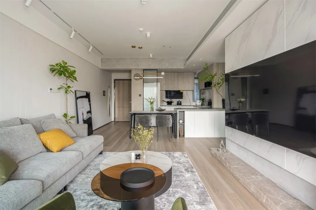 一起来看看吧!客厅设计LIVING ROOM全屋通铺灰调地板,无主灯设计维护辽阔视野,奠定低调质感基调,完全开放式的餐厨区无形中放大了玄关与公区视野。