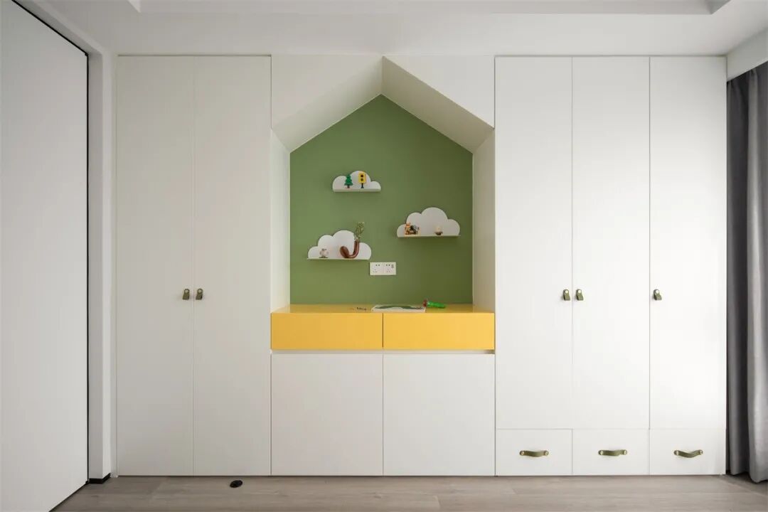 柜体用充满童趣的房屋造型留出书桌的位置。450mm的柜深,将更多的空间留给过道,留给小主人足够的活动空间。