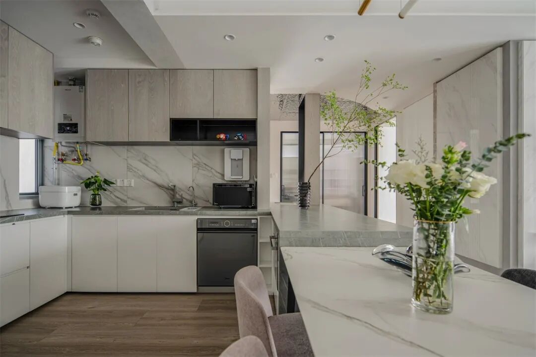 餐厨设计KITCHEN望向餐厨区,狭长型封闭式厨房到U字型开放式餐厨区,不仅是功能上的集中完善,空间上的开放有序,让各自忙碌的家人又无形陪伴。