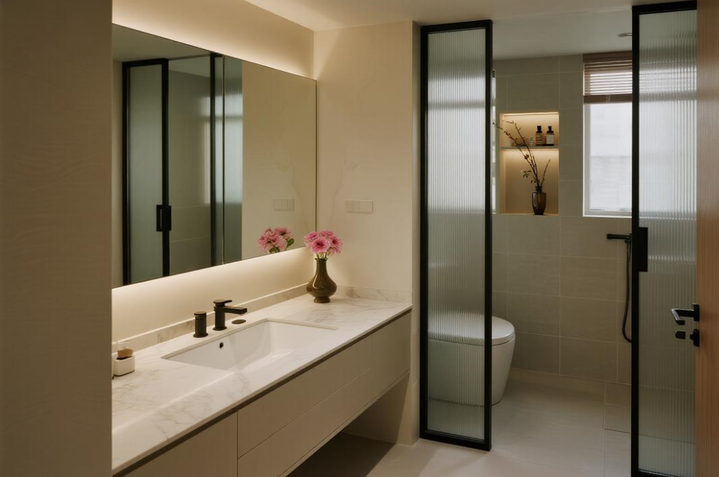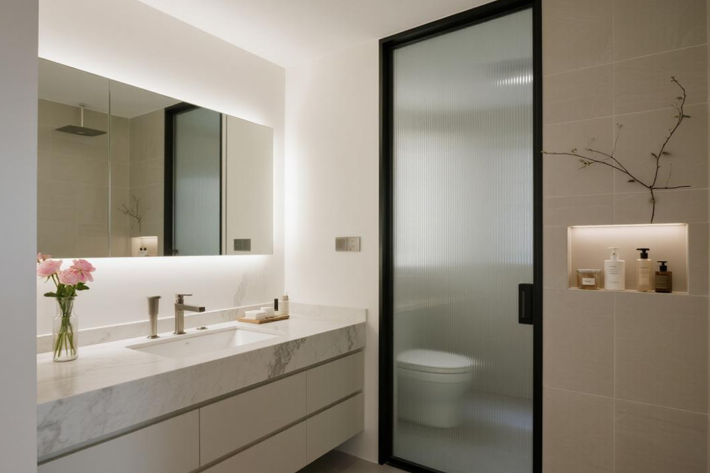 细节提醒:淋浴房底部要装挡水条,高度 5-8cm,避免水从底部渗出;玻璃门轨道选 “石基轨道”,比金属轨道更耐用,还不容易积灰。