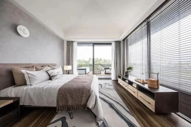 卧室床头墙是灰色的,床尾是一面全景玻璃窗,装上百叶帘,平时开启后就能拥有一个无限的自然风光视线。